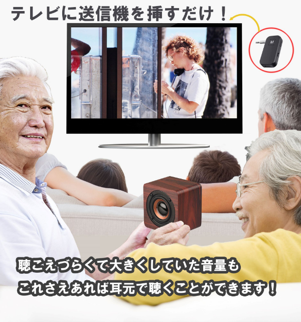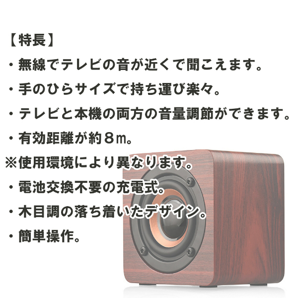 離れていてもテレビが聞き取りやすいワイヤレススピーカー!楽しみなテレビが聞き取りにくいが、近くの人に迷惑が掛かってしまうとあきらめていませんか?本品を使用すると、無線でテレビの音が近くで聞こえます。手のひらサイズで軽くて持ち運び楽々です。テレビと本機の両方の音量調節ができます。有効距離が約8m(※使用環境により異なります)。木目調の落ち着いたデザインを採用しました。簡単操作で誰でもかんたんに使えます。電池交換不要の充電式です。送信機につきましては、テレビについているイヤホンジャックにさしてお使いいただく形となります。イヤホンジャックがついているテレビであれば、ご使用可能です。