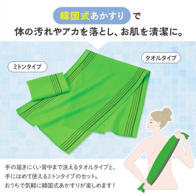 体の汚れやアカを洗い落とす韓国式あかすりセット。タオルタイプで届きにくい背中も清潔に!濡らすと生地が縮んで硬くなり、あかすりに適した状態になります。手にはめてしっかり洗えるミトンタイプ付!