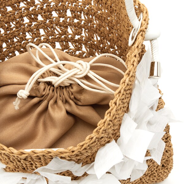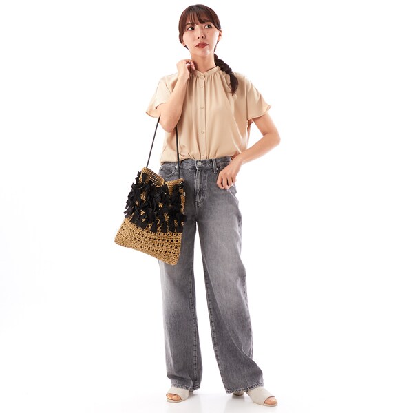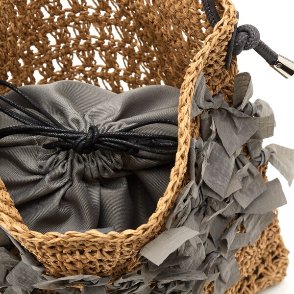 口元に取り付けたリボン状のナイロンがお花やフリルのように見える1本手トート。