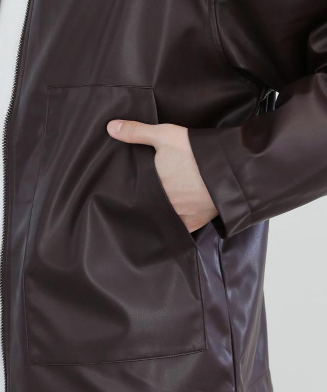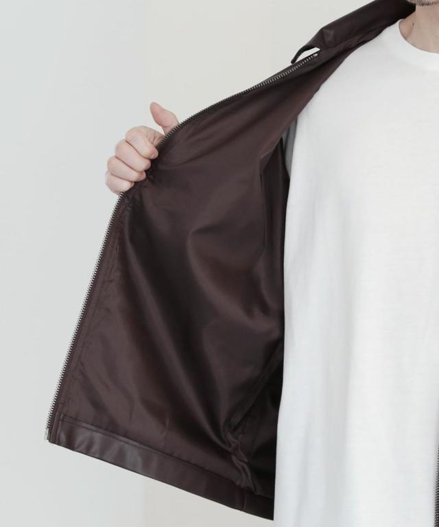 ほのかな艶感が高級感を感じさせながら、本革とは違い雨や汚れに強く入念なお手入れの必要がないのでデイリー使いがしやすい点もポイント。本格的なレザーの質感ながら、着疲れのしない軽い着心地。裏地付きで防風効果もあり、春先や秋口などの季節の変わり目に特にオススメの一着です。
