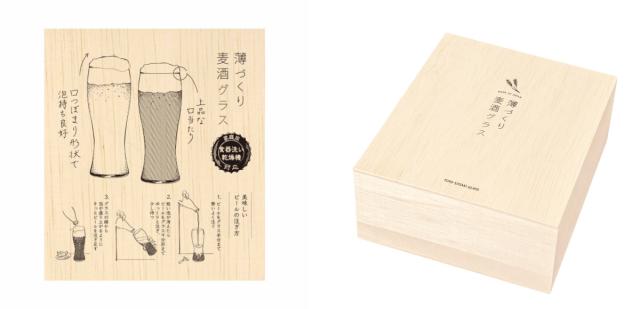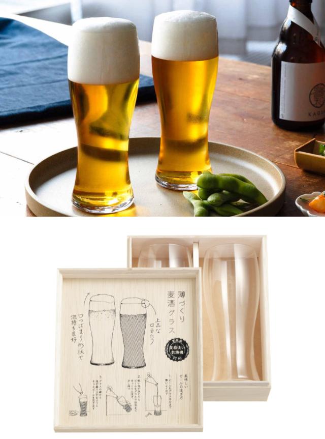 専用木箱に薄づくりの麦酒グラス2個セットが入ったビアグラスセットです。