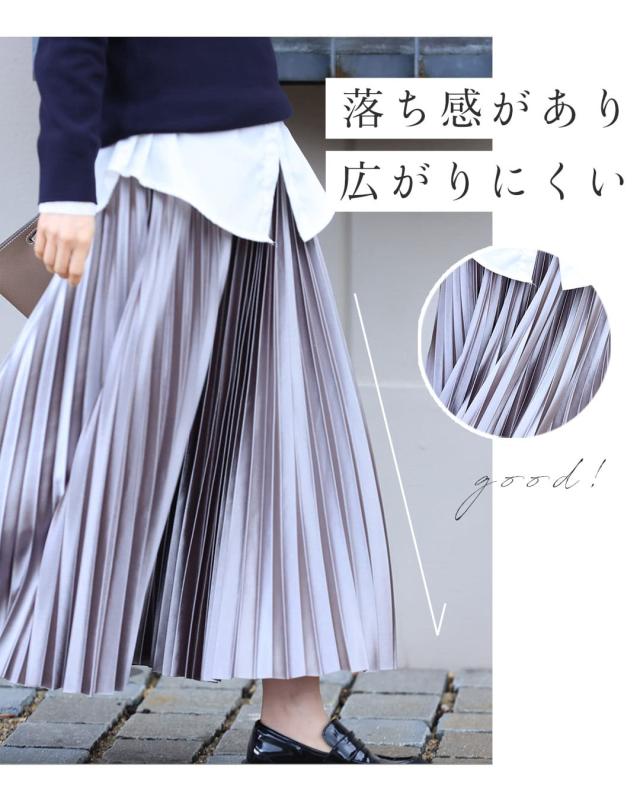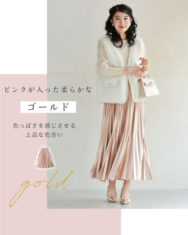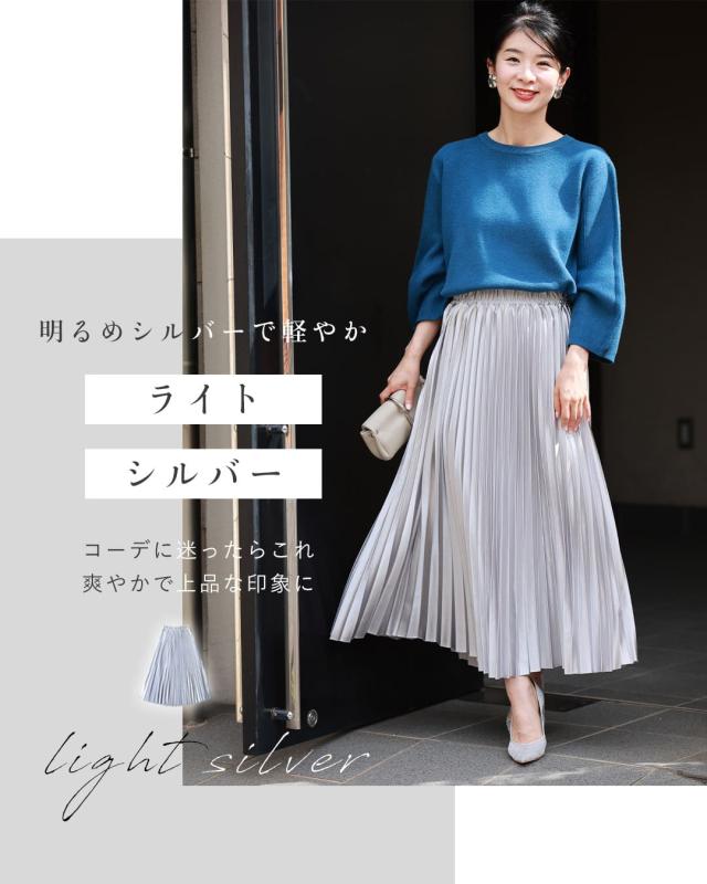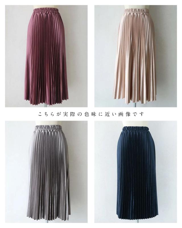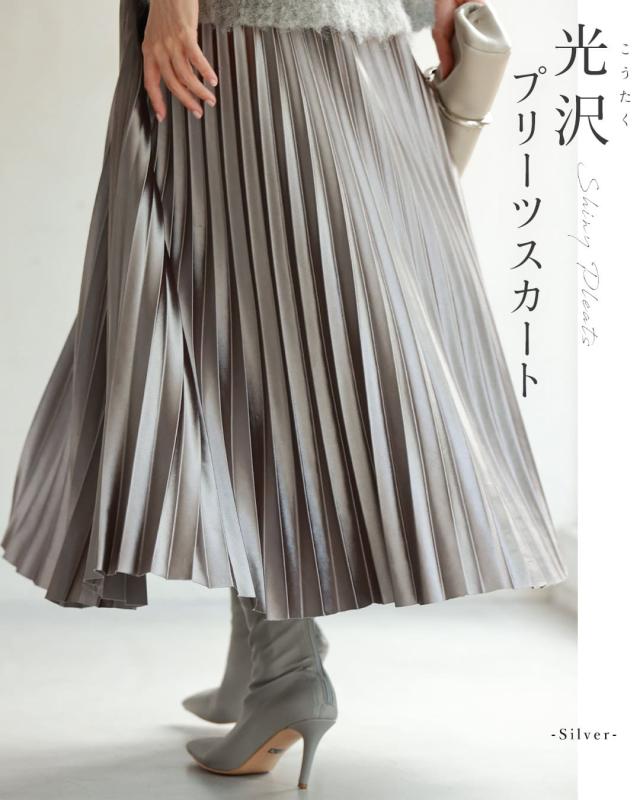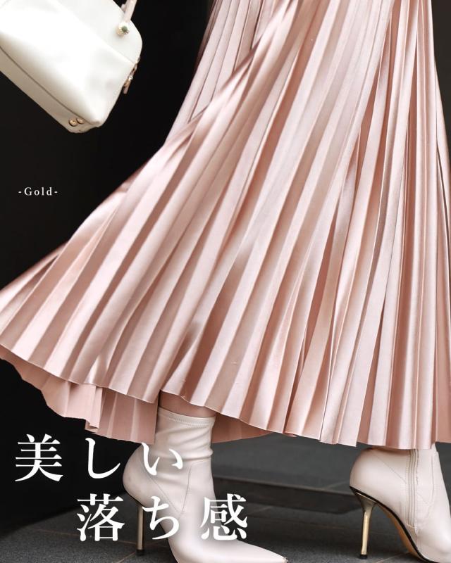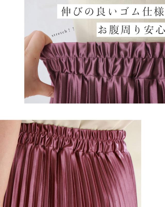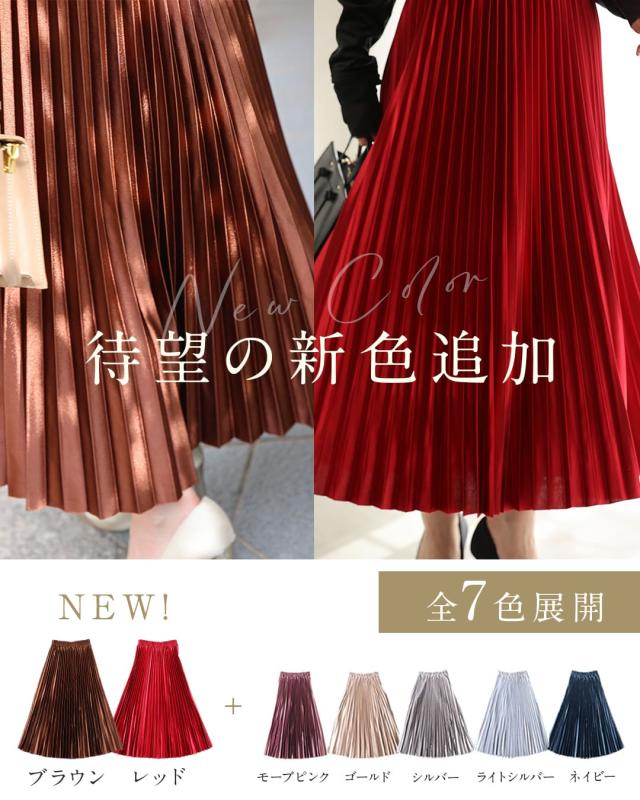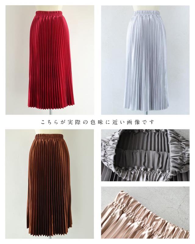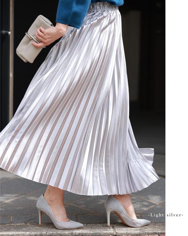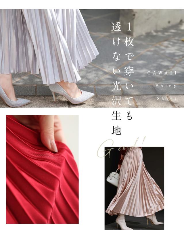 再入荷9月22日 落ち感 美しい 光沢 プリーツ スカート cawaii wkj00011 S~3L対応 夏服 夏物 春服 春物 総ゴム ミドル シルバー ゴールド 光沢 エレガント キレイめ 上品 女性らしい レディース ファッション ミセス 30代 40代 50代 母の日