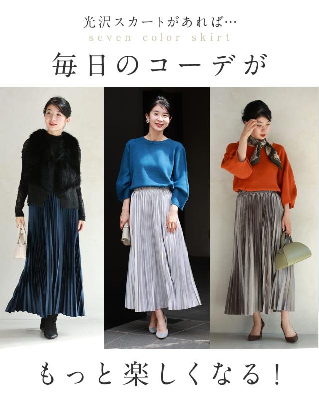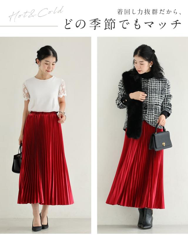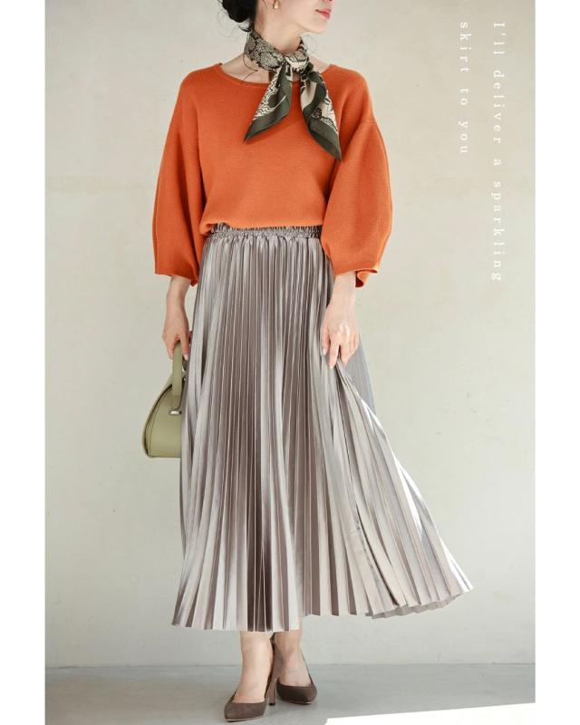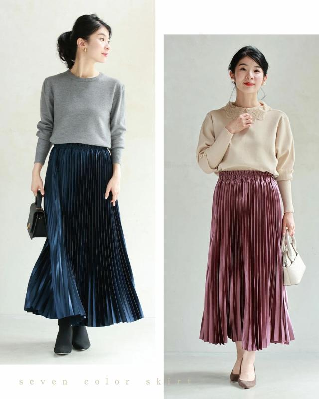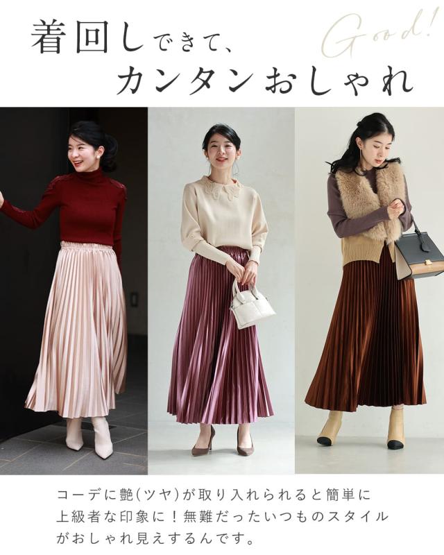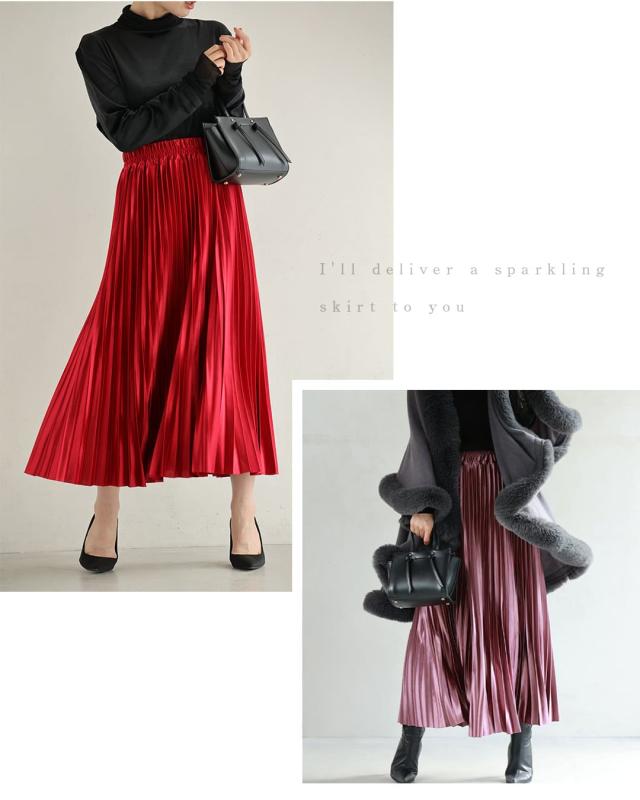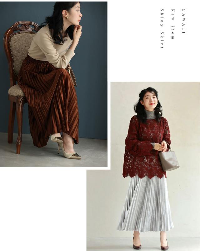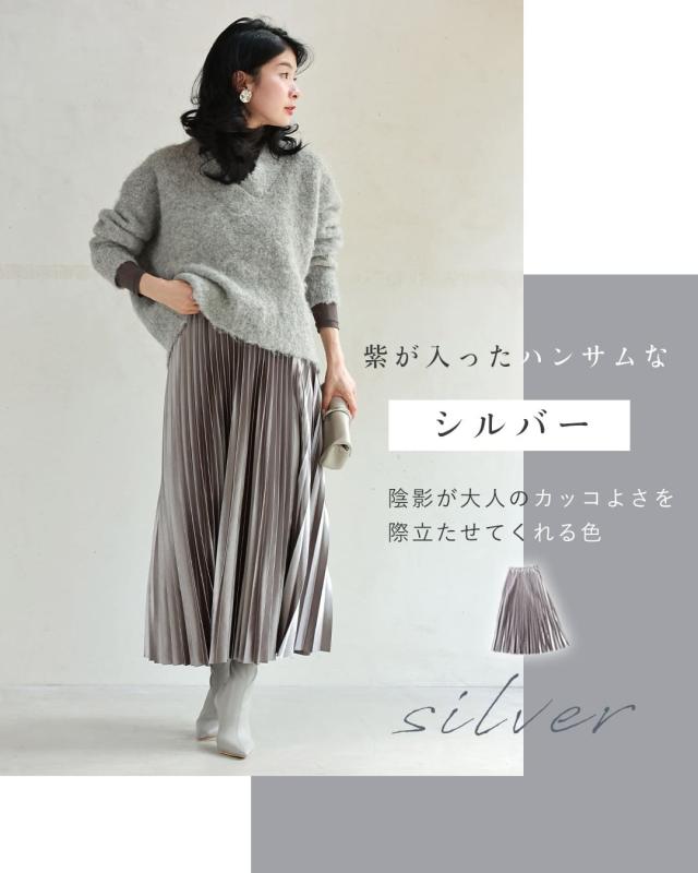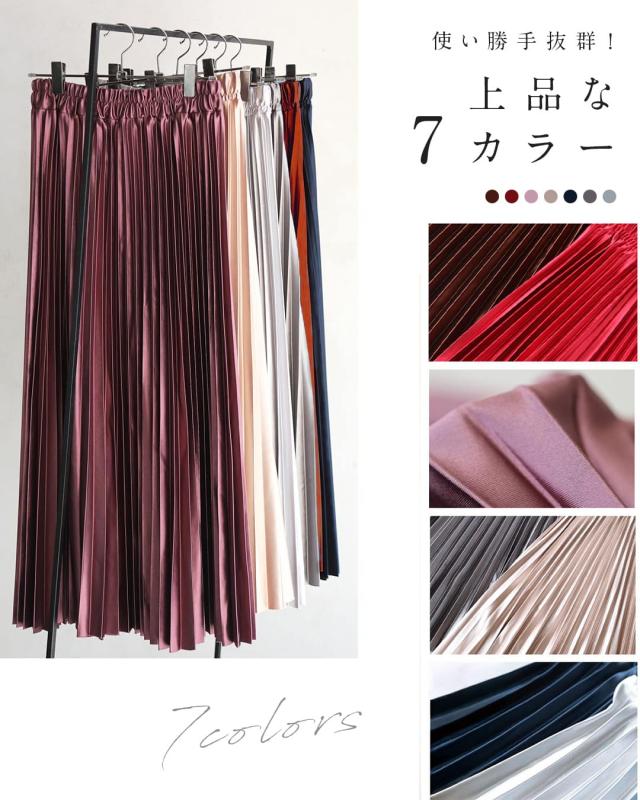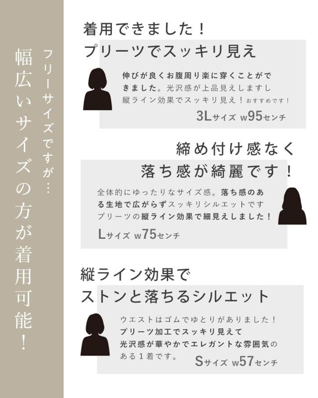 再入荷9月22日 落ち感 美しい 光沢 プリーツ スカート cawaii wkj00011 S~3L対応 夏服 夏物 春服 春物 総ゴム ミドル シルバー ゴールド 光沢 エレガント キレイめ 上品 女性らしい レディース ファッション ミセス 30代 40代 50代 母の日