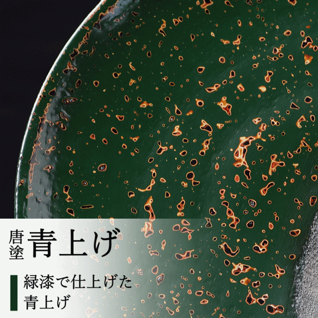 津軽塗には4つの技法がございます。 その中で代表格とされるのがこの唐塗(からぬり)です。 唐塗独特の複雑な斑点模様は、何度も塗っては乾かし、そして研ぐという作業を繰り返し、 全部で四十八の工程から生み出されます。 最終的なベースの色となる漆の色を変えると、仕上げの名称も変わります。 素黒目漆※1を塗って、あめ色の透明色に仕上げると「呂上げ」、赤漆を塗ると「赤上げ」と呼びます。 完成までには最低でも一ヶ月半〜二ヶ月を要し、その大変丁寧な技法から「津軽のバカ塗り」ともいわれております。 ※1 素黒目(すぐろめ)漆 何も添加せず透明度の高い漆。漆本来のツヤが特徴です。 |