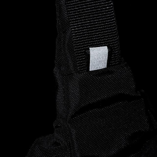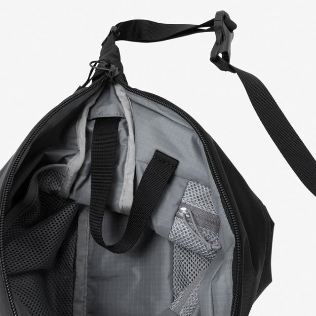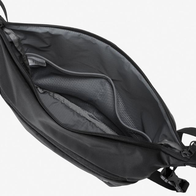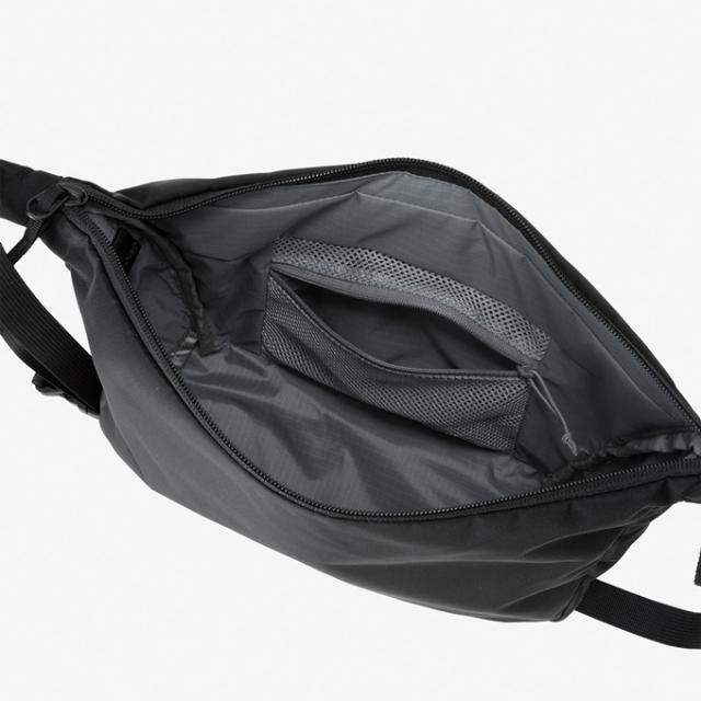 500mlボトルや手帳なども収納可能な5L容量。本体内部には、小物の仕分けに便利なスリットポケットとファスナー付のメッシュポケットを備えています。メインファブリックには、リサイクルナイロンを採用して環境に配慮。体に寄り添うデザインと、本体内部に収納できるショルダーベルトのテープエンド仕様は、見た目にもスマートなアイテムです。