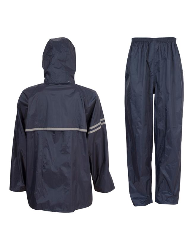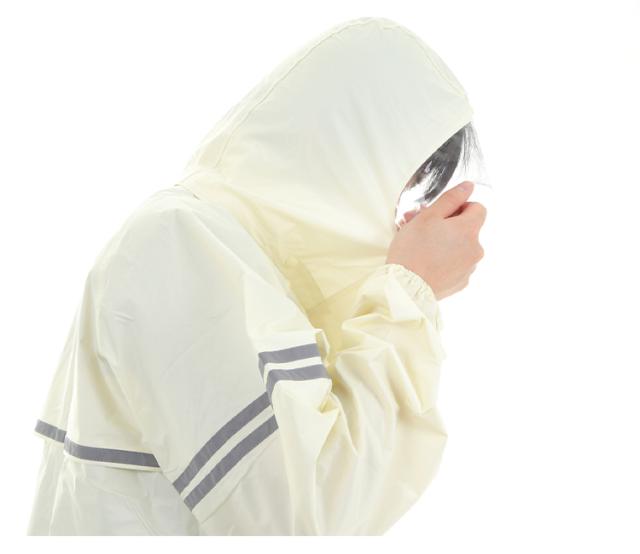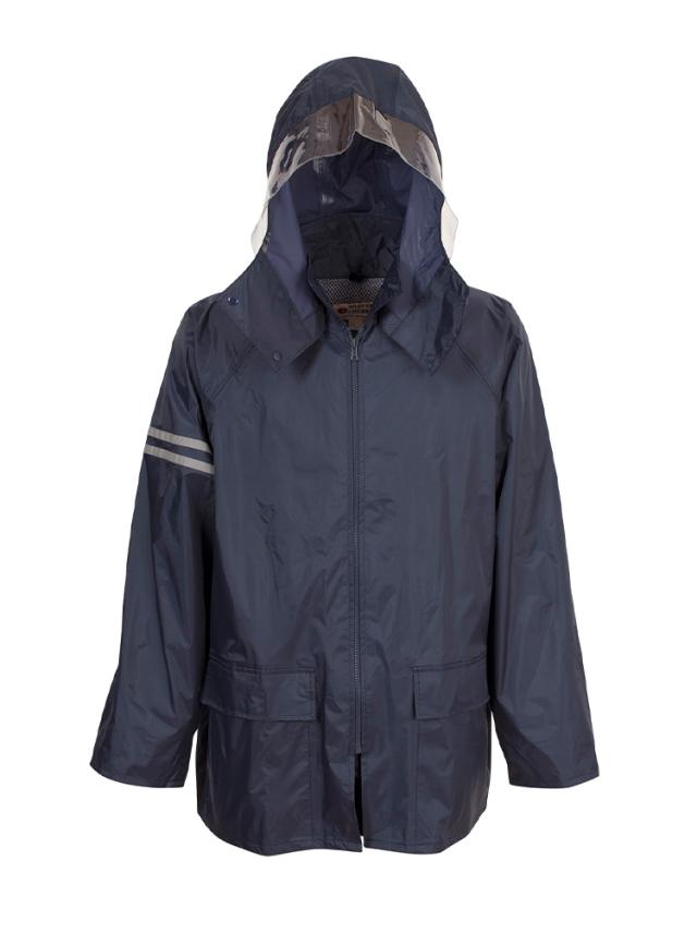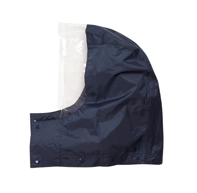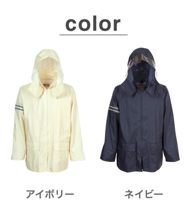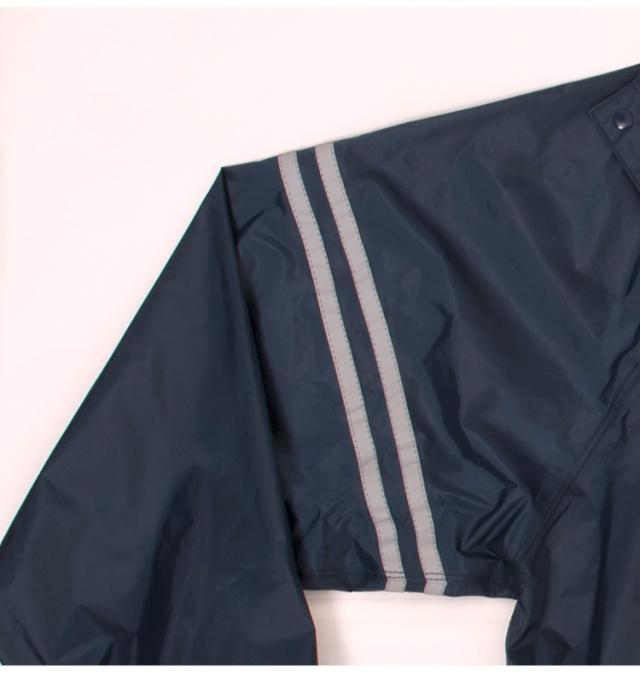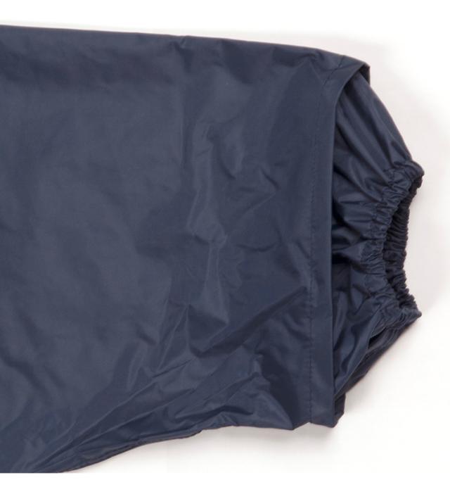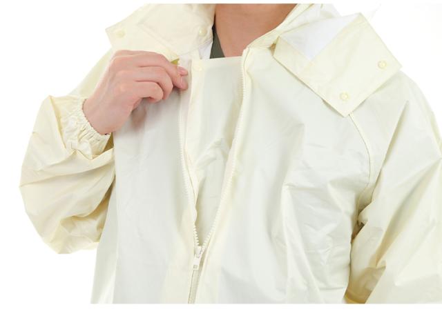 顔まわりは透明の取り外し可能なフード。クリアな視界を確保。ボタンを閉じれば口元までガードできます。内側のゴム袖の上からさらに袖で覆うことにより、吹き付ける雨も浸入しにくくしています。前合わせはファスナーとスナップボタンにより、雨の浸入を二重にブロック。反射テープを右袖と背中に配置。夜間や薄暗い雨の日にも視認性を高めています。レインスーツと同色の収納袋付き。ジャケットと収納袋にはネームタグ付き。