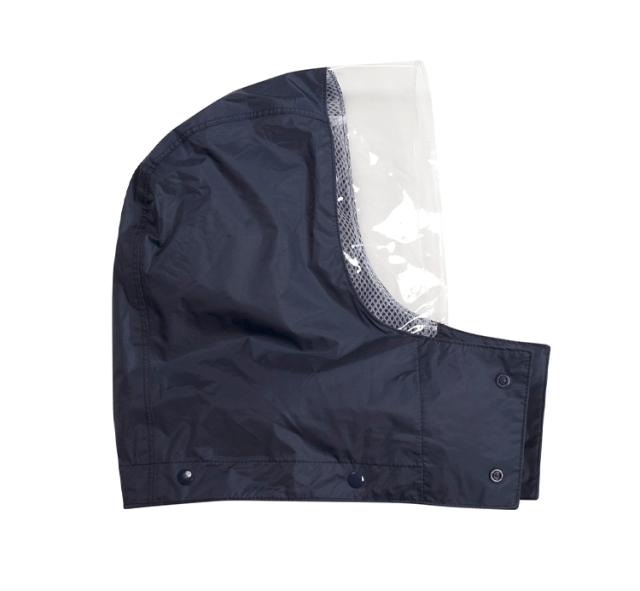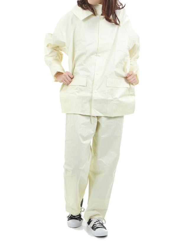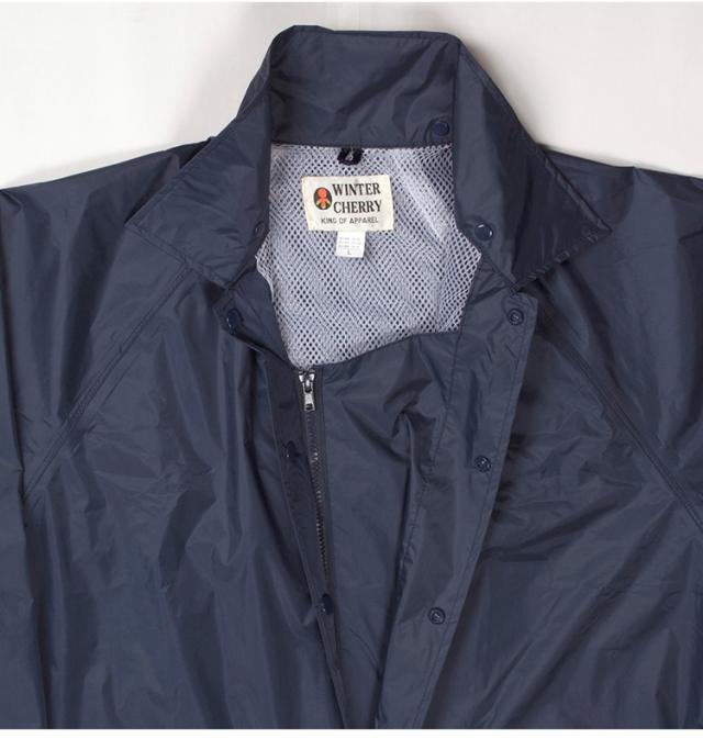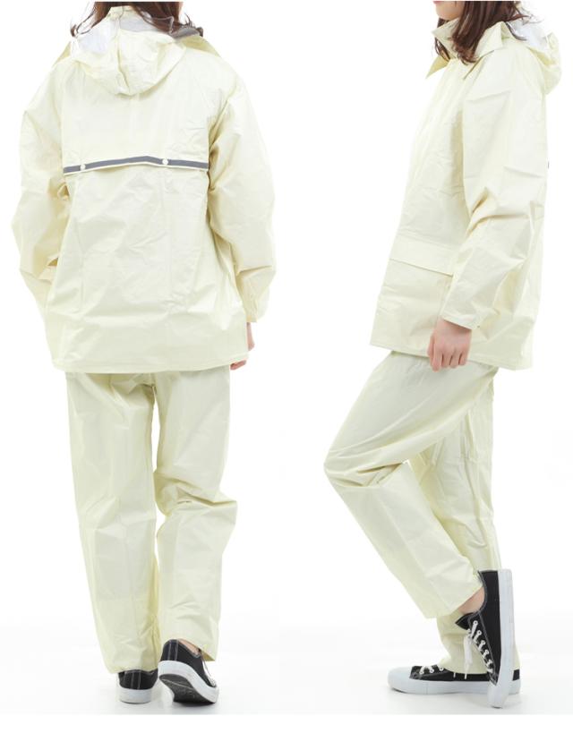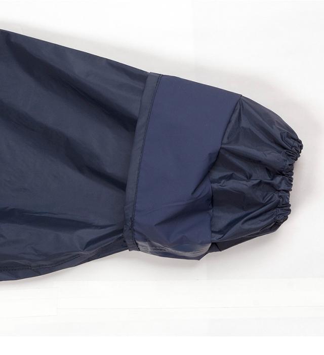 顔まわりの透明の取り外し可能なフードは、クリアな視界を確保。ボタンを閉じれば口元までガードできます。前合わせはファスナーとスナップボタンで雨の浸入を二重にブロック。内側のゴム袖の上からさらに袖を覆うことにより、吹き付ける雨も浸入しにくくしています。反射テープを背中に幅広に配置し、夜間や薄暗い雨の日にも後方からの視認性を確保しています。ジャケット・パンツとも裏地にメッシュを付け、汗をかいてもべとつかず、快適な着心地が続きます。レインスーツと同色の収納袋付き。ジャケットと収納袋にはネームタグ付き。