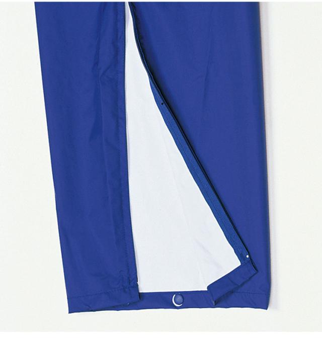 防水性と透湿性を両立させた東レのエントラントを使用。襟元収納式のフードは、ストッパー付きの調節ゴム付き。フードの先にハリを持たせ、視界を確保しています。フロントファスナーを左右の生地で覆うタイプのダブル前立てを採用。雨の浸入を防ぎます。左胸には反射ワッペンを付け、夜間の視認性を高めています。ジャケット裾はポケット内のドローコードを引っ張ることで、お好みのフィット感に調整可能。パンツ裾内側のファスナーにより、靴を履いたままで着脱可能。スナップボタンで裾幅も調整できます。総裏メッシュでべたつき感を緩和。