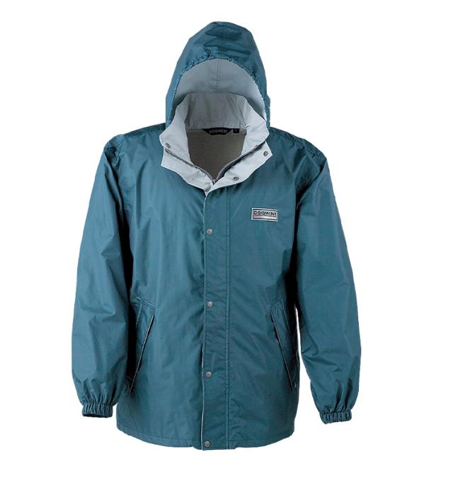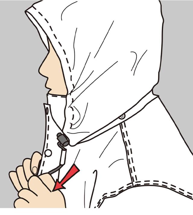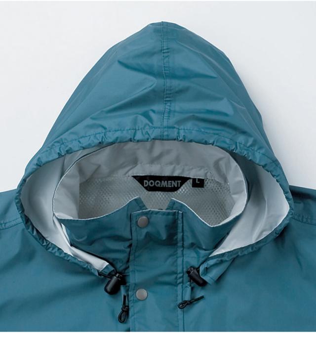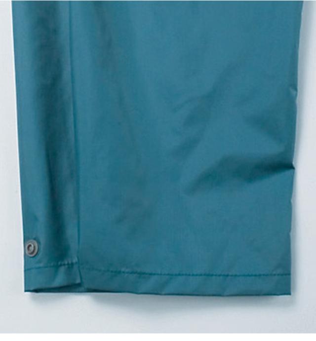 防水性と透湿性を両立させた東レのエントラントを使用。表の透湿素材に加え、裏地にはメッシュを使用。ムレ対策に考慮しています。フードは丸ゴムを引くだけでフィット感を調節できます。フードは襟元に収納できるタイプで、かぶらない時は邪魔になりません。左胸には反射ワッペンを付け、薄暗い雨の日や夜間の視認性を高めています。ジャケット裾はポケット内のドローコード調節でお好みのフィット感に調整可能。パンツ裾幅を調節できるスナップボタン付き。レインスーツと同色の収納袋付きで持ち運びに便利。