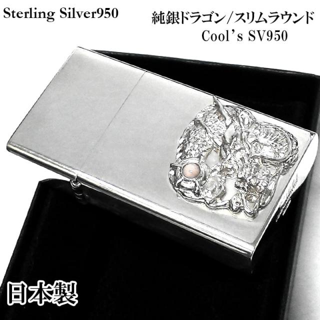 スターリングシルバー950 一点物 オイルライター スリム レア ドラゴン 絶版 ラウンドモデル Cools 純銀メタル 廃盤 天然珊瑚