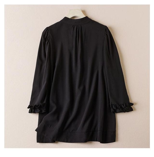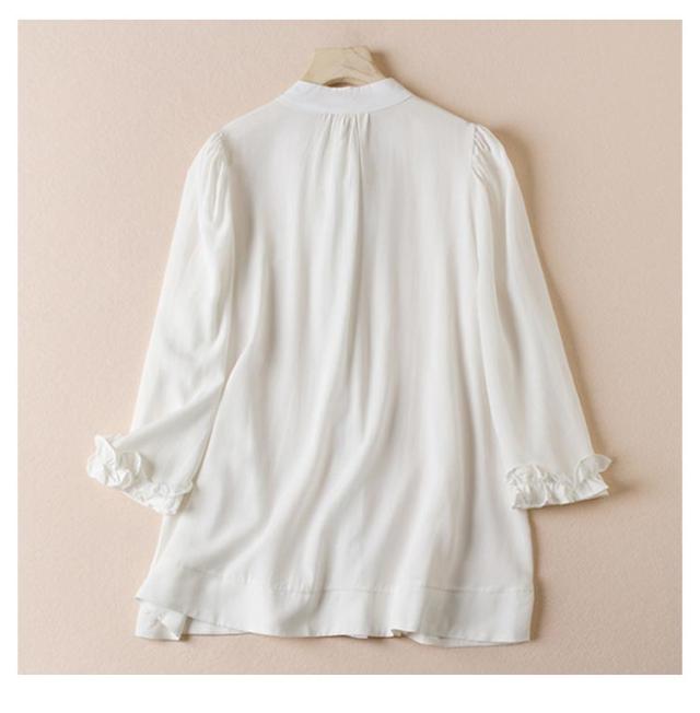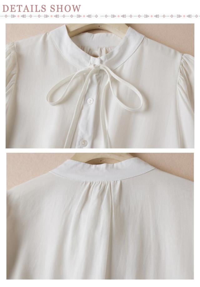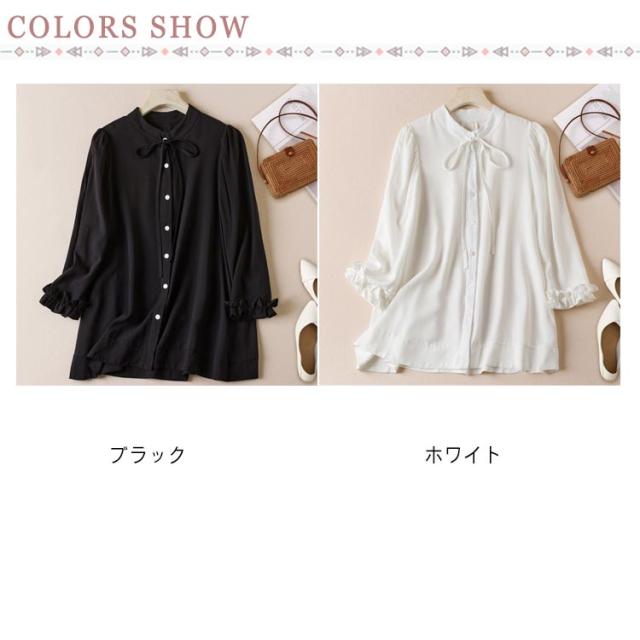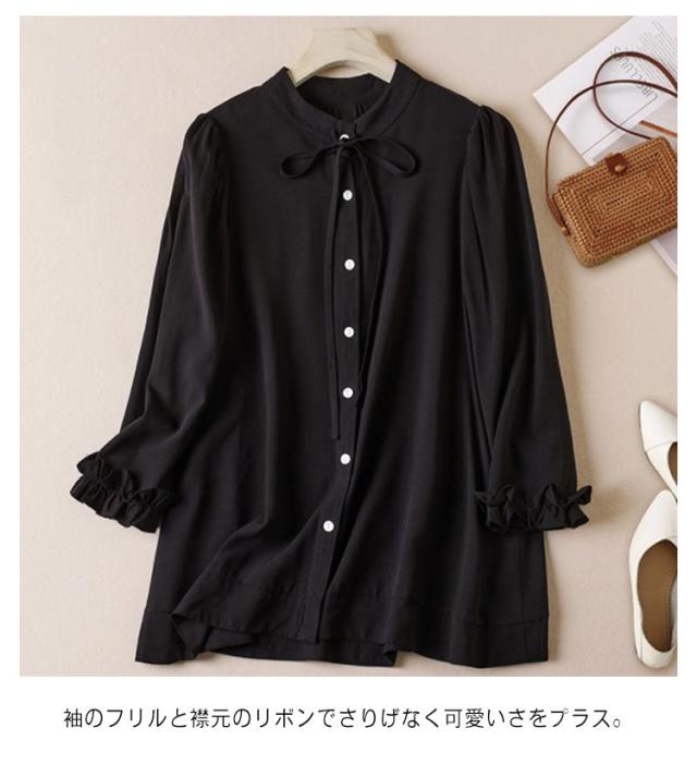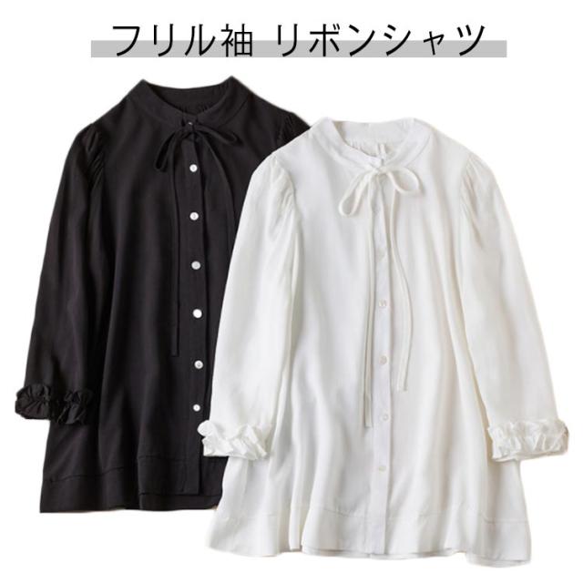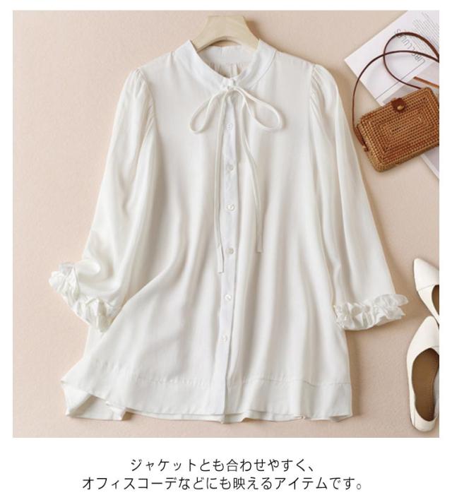 シャツ ブラウス リボンシャツ レディース 胸元リボン 袖フリル 七分袖 バンドカラー フリルシャツ 前開き フロントボタン トップス かわいい 通勤 オケージョン オフィスカジュアル セレモニー
