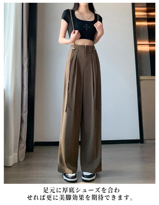 スラックス パンツ レディース サスペンダー ストレート セミワイド 2way タックパンツ ハイウェスト サスペンダーパンツ ポケットあり カジュアル おしゃれ オフィスカジュアル 春 夏