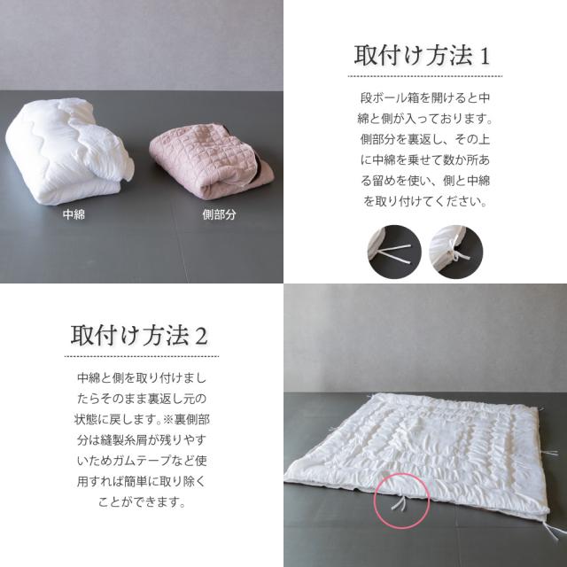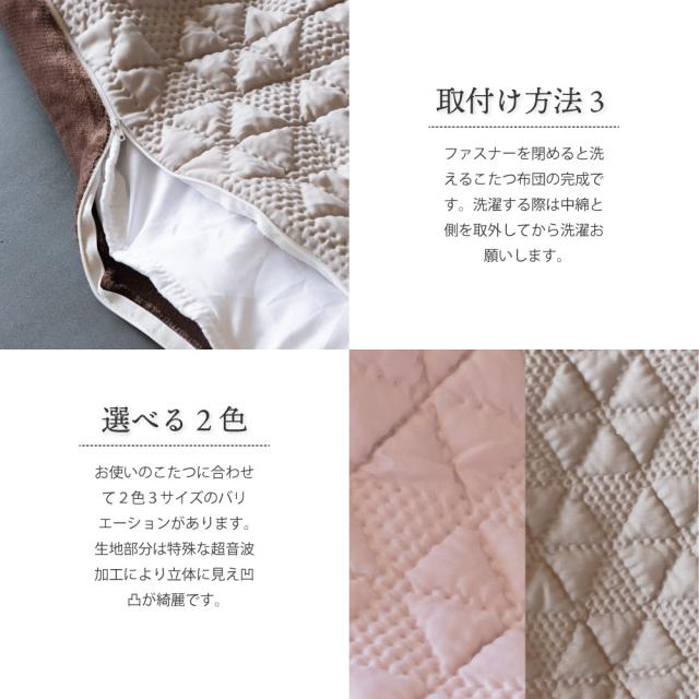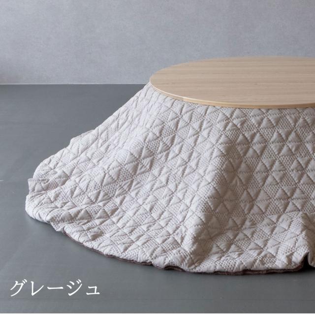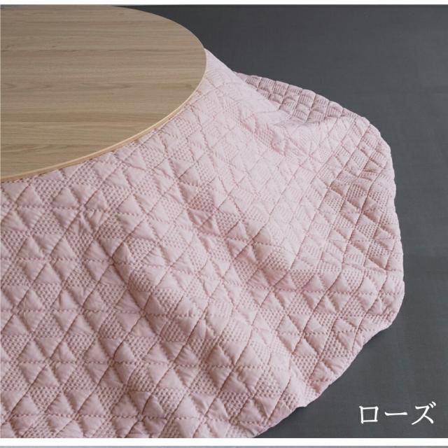 <サイズ>天板幅75cm〜105cm円形対応<素材>表地・ポリエステル/中綿・ポリエステル/裏地・ポリエステル<生産>中国製<カラー>グレージュ/ローズ※こたつ布団単品となります※光の加減や角度により色の見え方が多少異なる場合がございます
