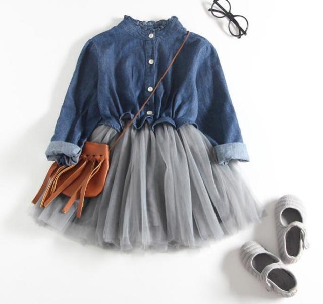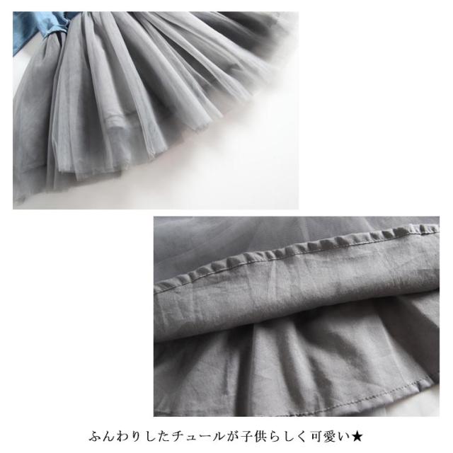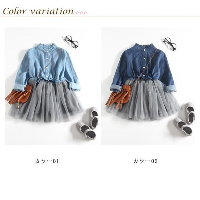 デニムワンピース 子供服 ワンピース チュールワンピース 女の子 女児 長袖 切り替え シャツワンピース チュールスカート フリルネック ミディアムワンピース ふんわり 可愛い 春秋 春新作