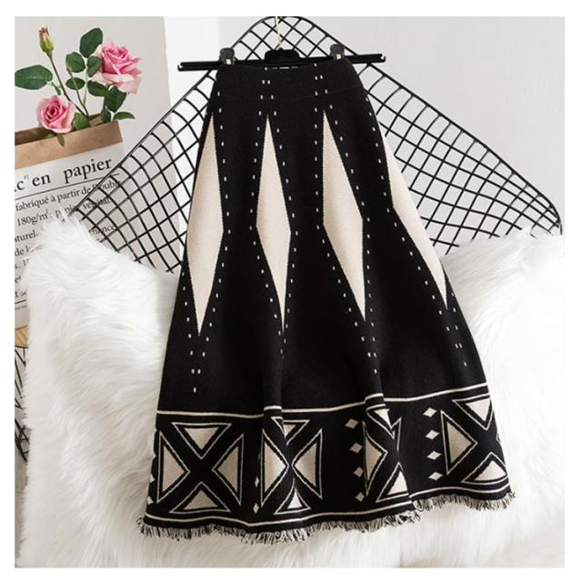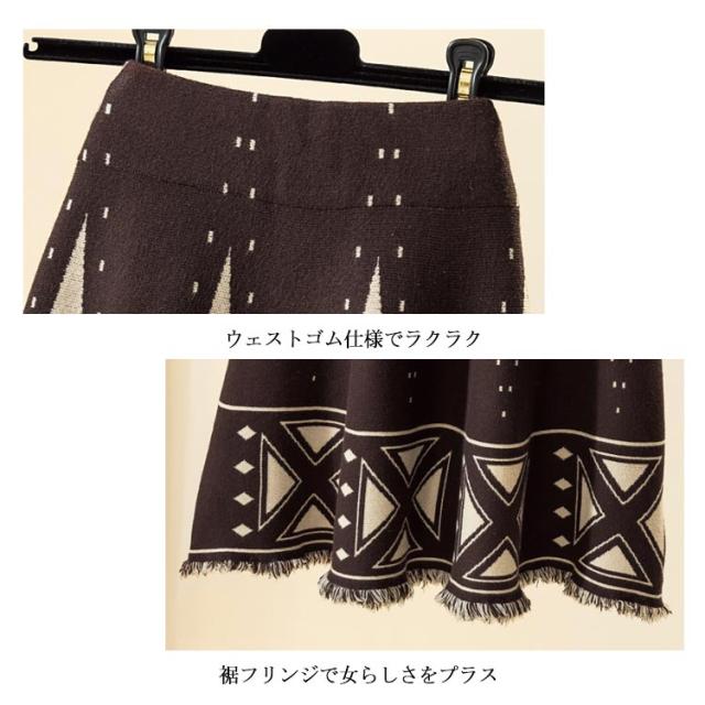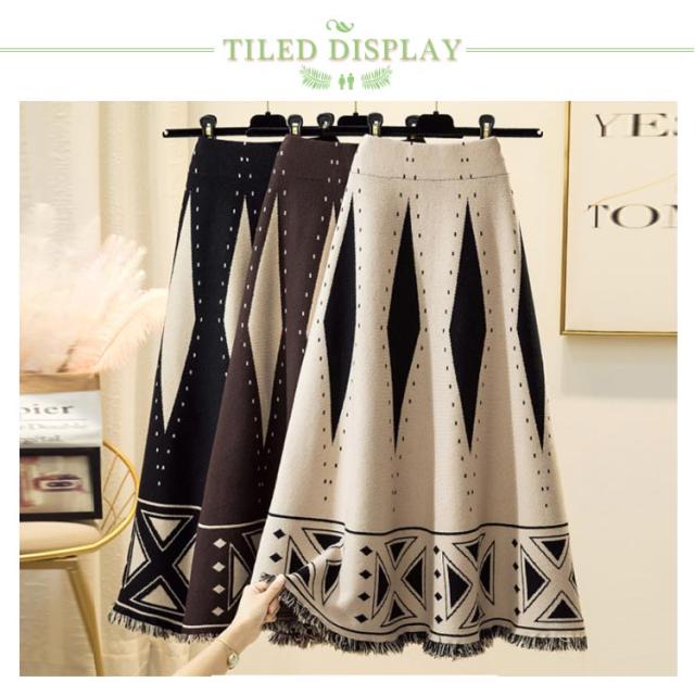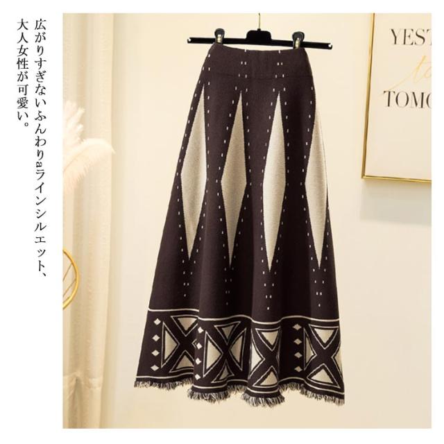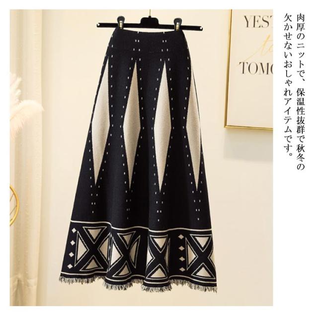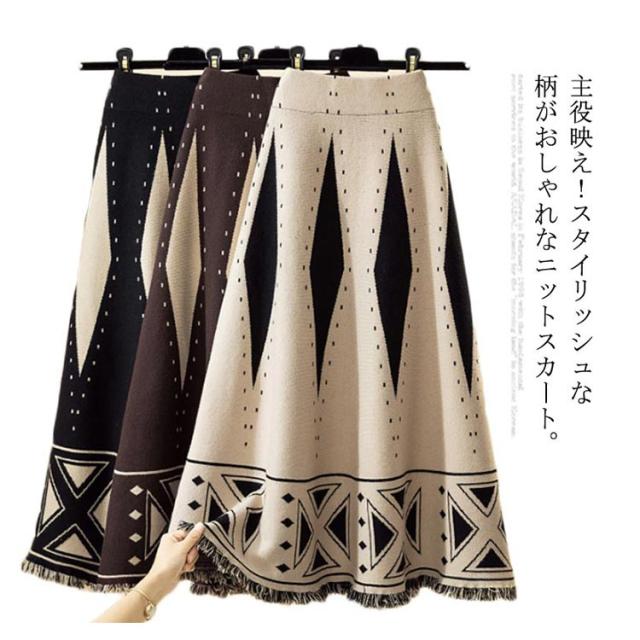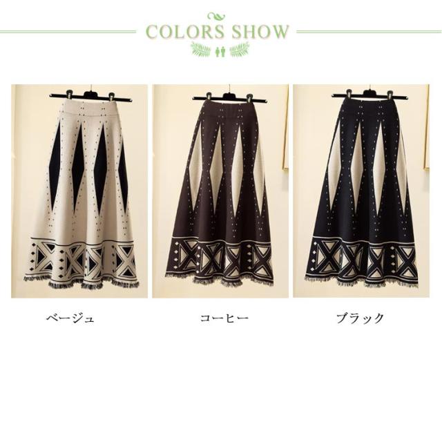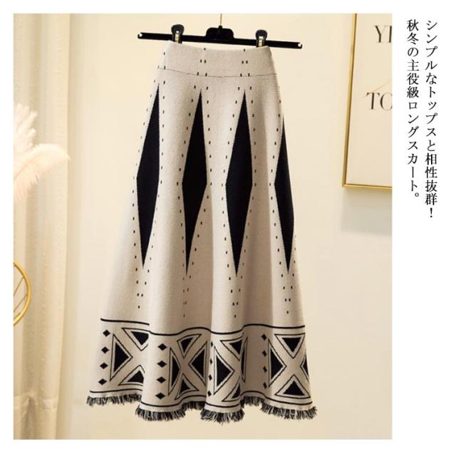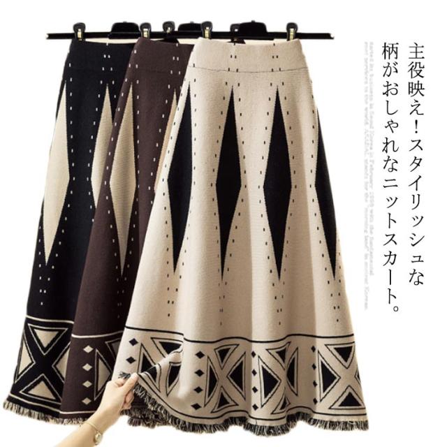 ニット スカート Aライン 幾何学模様 ニットスカート レディース ロングスカート フリンジ 菱形柄 秋冬 冬服 ミモレ丈 キレイめ
