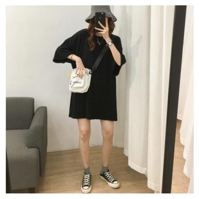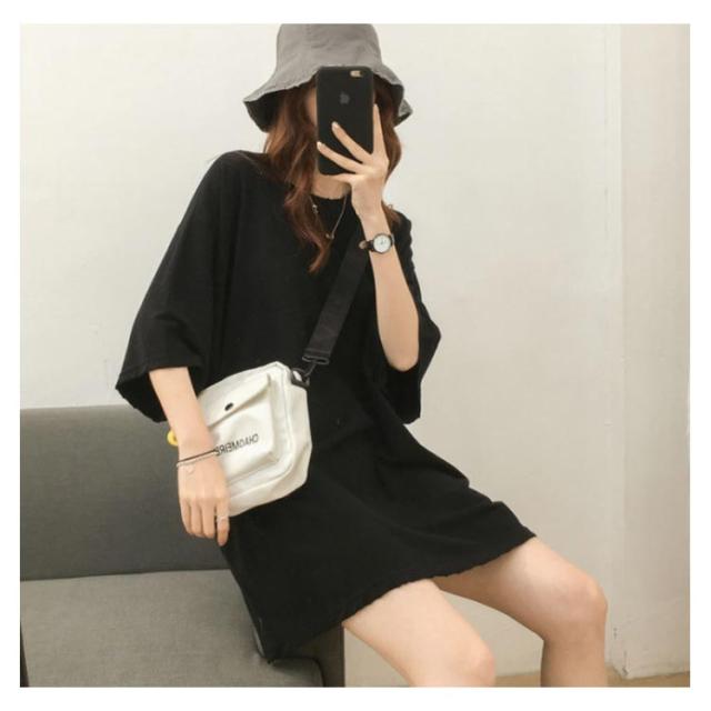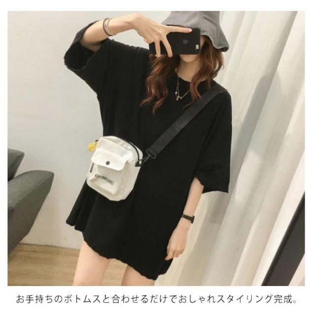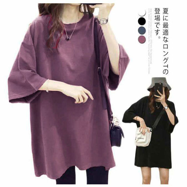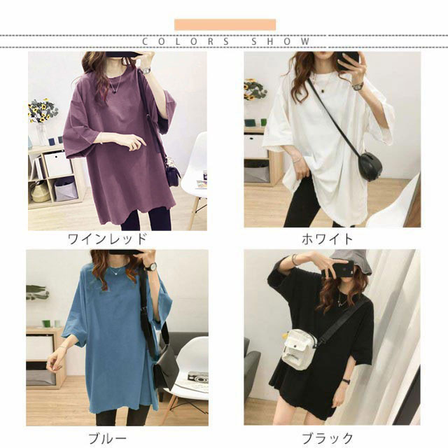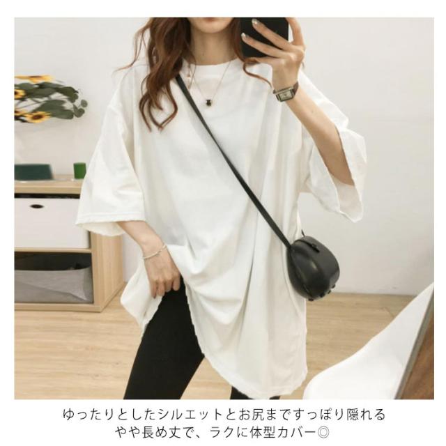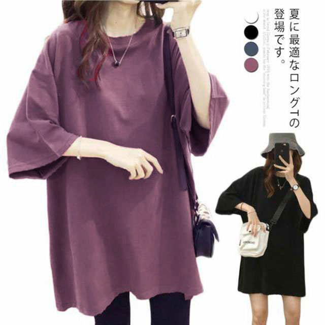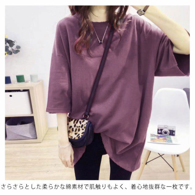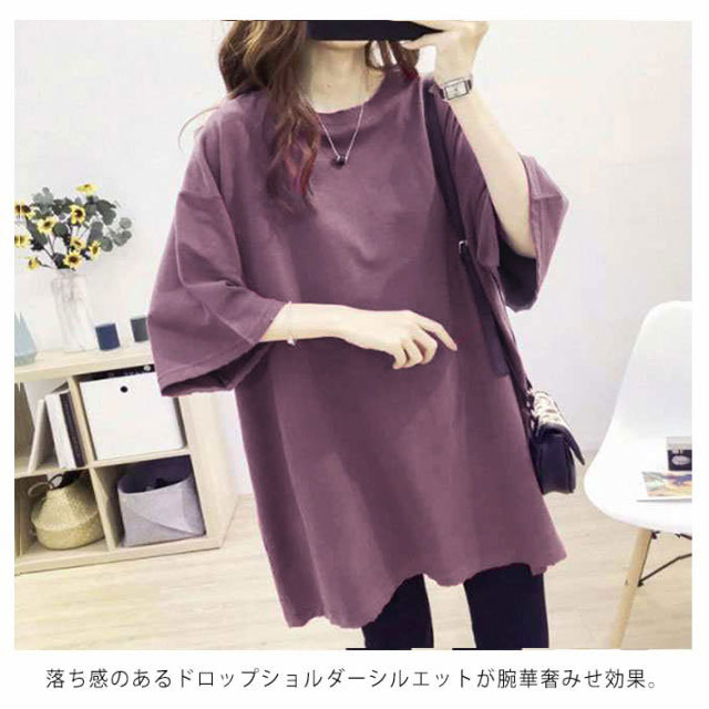 ロングtシャツ レディース 半袖 ゆる Tシャツ ロングT ドロップショルダー ロングティーシャツ 五分袖 カットソー クルーネック ダンス衣装 ストリート系 カジュアル 体型カバー 春 夏 送料無料 無地