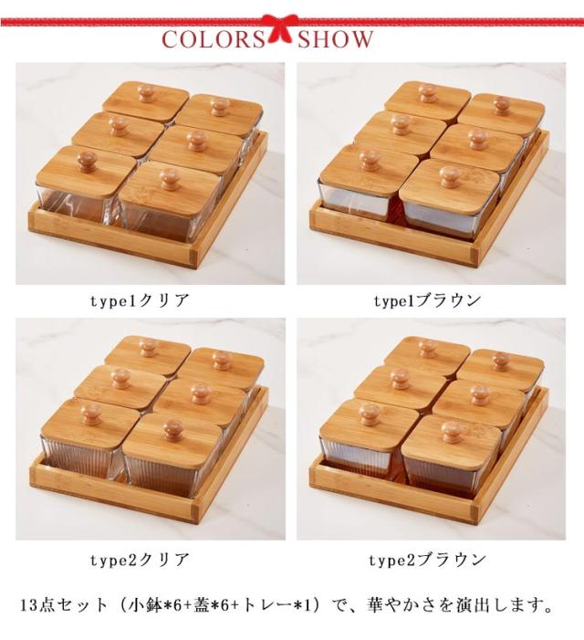 | サイズについての説明 | 13点(小鉢*6+蓋*6+トレー*1) 小鉢サイズ:8.8*5.4cm トレーサイズ:29*20cm 高約2.8cm ※天然竹を使用していますので、画像の色とは異なる場合があります。また、製品ひとつひとつの木目は異なります。 |