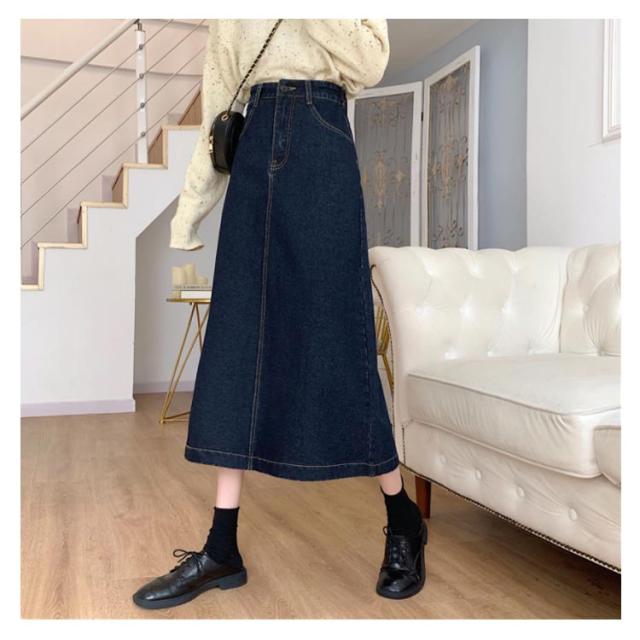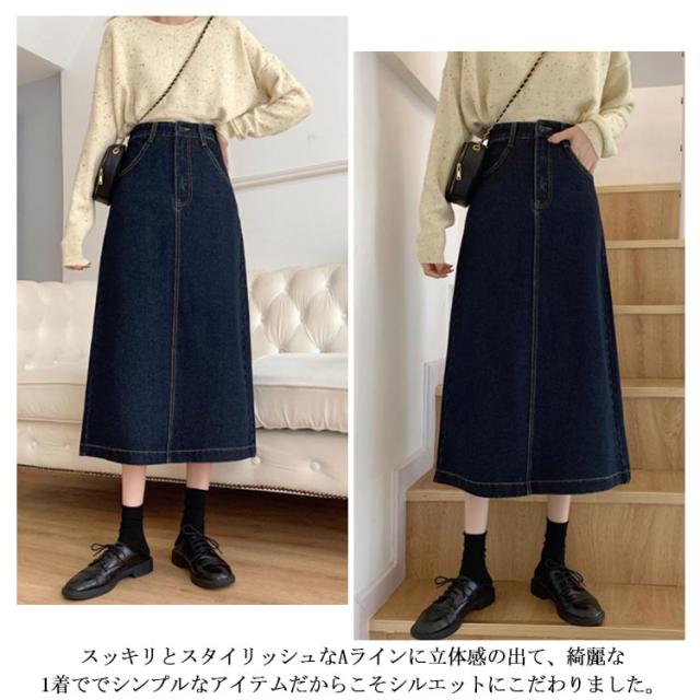Aライン デニムロングスカート デニムスカート ロング 冬 秋冬 スリット バックスリット ウエストボタン調整可能 ダークブルー ブラック シルエット マキシ丈 デニム ロング スカート カジュアル ジーンズ フレア 大人 ハイウエスト 無地 シンプル