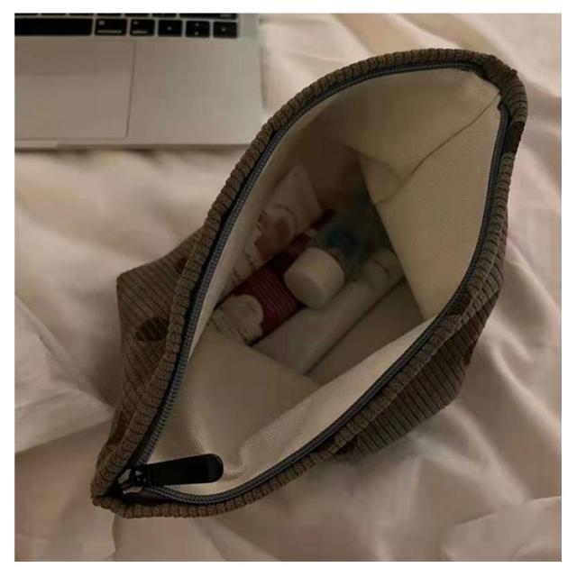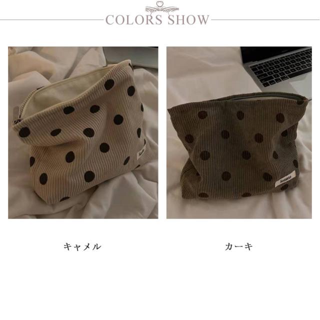 | 大容量で収納力バツグン、持ち歩きも便利なメイクポーチです。 ファスナーが大きく開く、使いたい物をさっと取り出せるのが便利です。 柔らかいコーデュロイ生地とドット柄は可愛さを演出し、しっかりの仕上がりです。 ご自宅、お出掛け、旅行用、小物入れ、バッグインバッグとしてぴったり。 | |