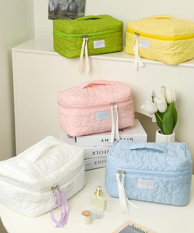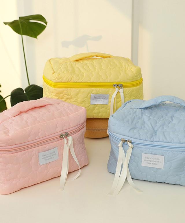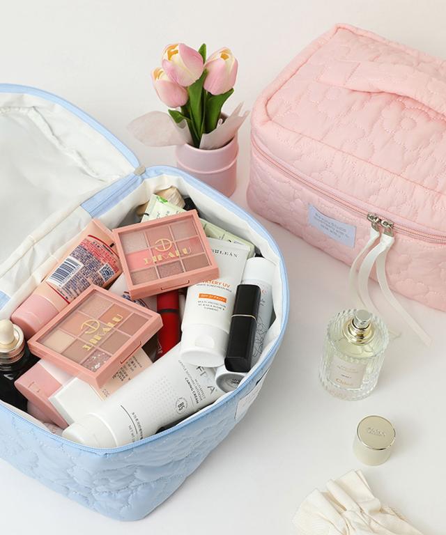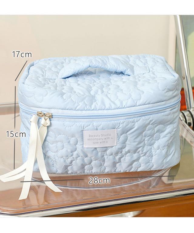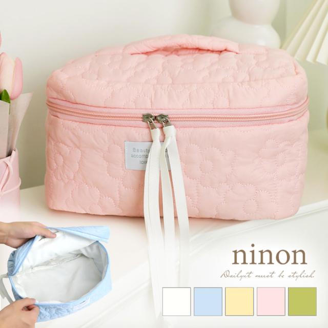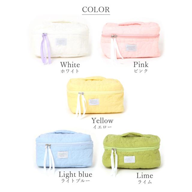 ポーチ レディース おしゃれ かわいい 可愛い 小物入れ 大容量 大きめ 持ち手 化粧ポーチ 旅行 使いやすい 持ち運び フラワー 花柄 メイクポーチ 横長 通勤 通学 カジュアル 大人 シンプル コスメポーチ コスメ ピンク マチ やわらかい キルト ふっくら メイク 自立 白 大人
