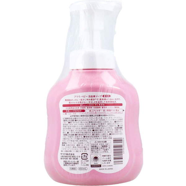 泡ボディソープ 本体ボトル 赤ちゃん ベビー用 アラウ.ベビー 泡全身ソープ 敏感肌 無添加 無香タイプ ポンプ 450ml