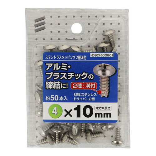 十字穴付きのトラス頭タッピングねじです。座面が大きいので、座面陥没を防止する効果があります。相手部材には規定の下穴が必要です。材質はステンレスで耐食性、耐熱性にすぐれています。