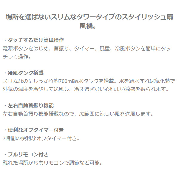 ■機能:タッチパネル操作、冷風機能、左右自動首振り、7時間切タイマー、冷却タンク付き、フルリモコン操作