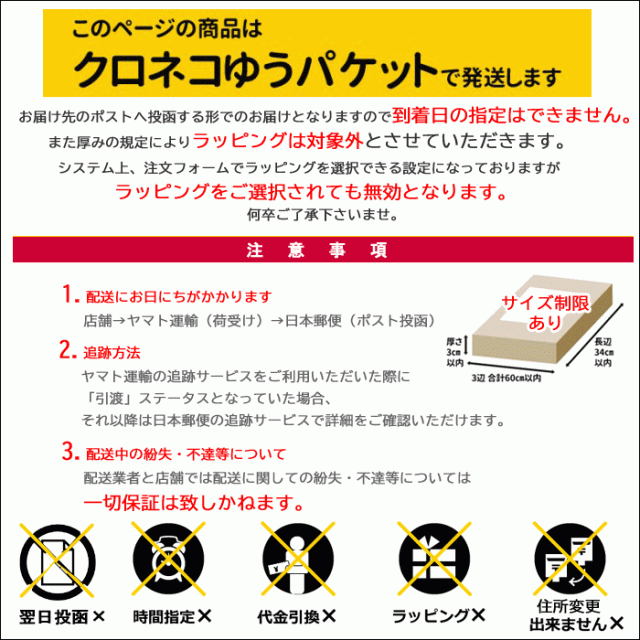 | 【ご注意】 | *こちらはポスト投函可能商品です。厚みに規定がありますのでラッピングはカートでお選びいただいても対象外となります旨ご了承下さいませ。 |