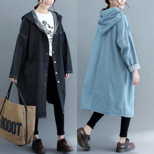 アウター デニム ロング ジャケット コート オーバーサイズ 大きめ ミドル丈 フード付き ポケット付き シンプル 無地 ドロップショルダー ゆるだぼ ゆる ゆったり ルーズ フロントボタン 綿 コットン 体型カバー ママ マタニティ 公園デビュー カジュアル 通勤 通学 学生 おでかけ デート 旅行 休日 普段着 普段使い 着回し 春 秋 レディース ワンサイズ ライトブルー 水色 ダークブルー 紺 ブラック 黒