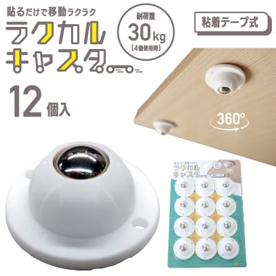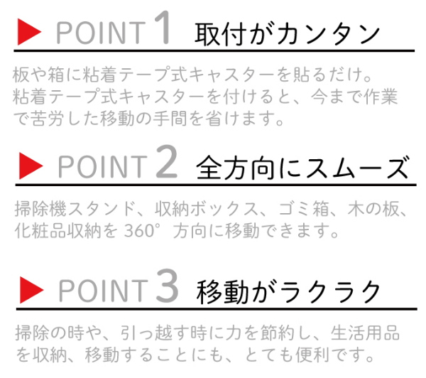 後付けキャスターで移動ラクラク!粘着テープ式でいろいろなものをキャスター付きにできる便利グッズです。取付カンタン360度回転するボール型キャスター!板や箱に粘着テープ式のキャスターを張るだけ。キャスターをつけると、今まで作業で苦労した移動の手間を省けます。重たい家電に貼れば、動かしやすく掃除も効率よくでき、木の板などに貼れば簡易台車に早変わり。お水や灯油などの移動にとっても便利です。全方向スムーズに移動。掃除機スタンド、収納ボックス、ごみ箱などキャスターをつければ360度方向に移動可能です。掃除や季節ごとの生活用品の入れ替えなど、移動させるのに労力がかかるものにつければ簡単に動かせストレスフリー。