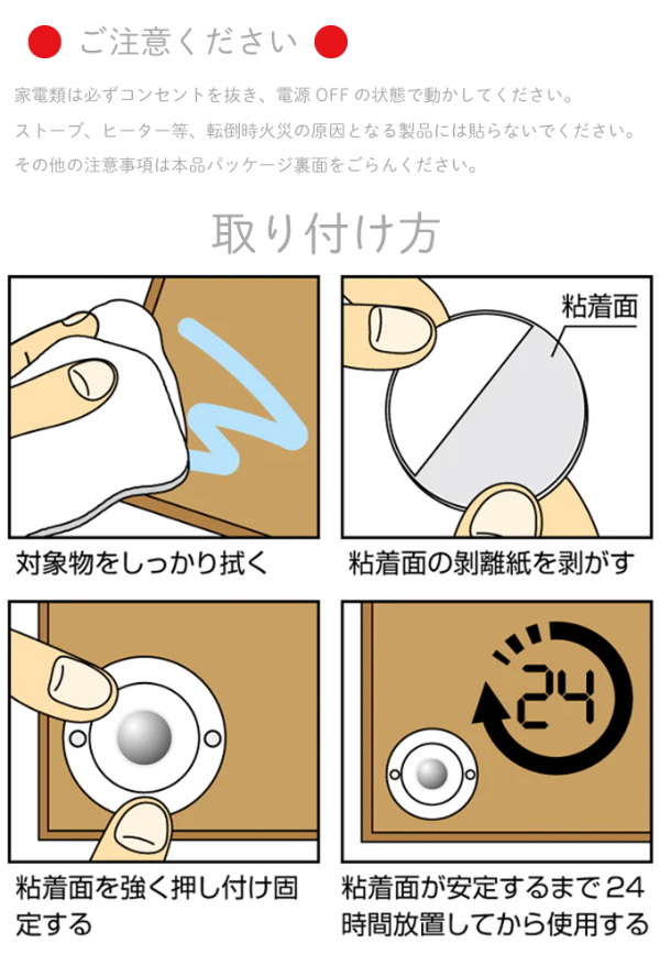 【商品サイズ(約)】φ4.2×高さ2.2cm(1個)【商品重量(約)】24g(1個)【入数】12個入【材質】■本体:ABS■ボール:スチール【取付可能な材質】プラスチック、木製品、ステンレス、段ボール、金属塗装面、プリント合板、凹凸のない滑らかな面【耐荷重】30kg(キャスター4個使用時)【注意事項】※取り付けにビスを使う場合は「M3-10」を使用してください。(商品には入っていません)【生産国】中国【メーカー】Lutte(ルッテ)
