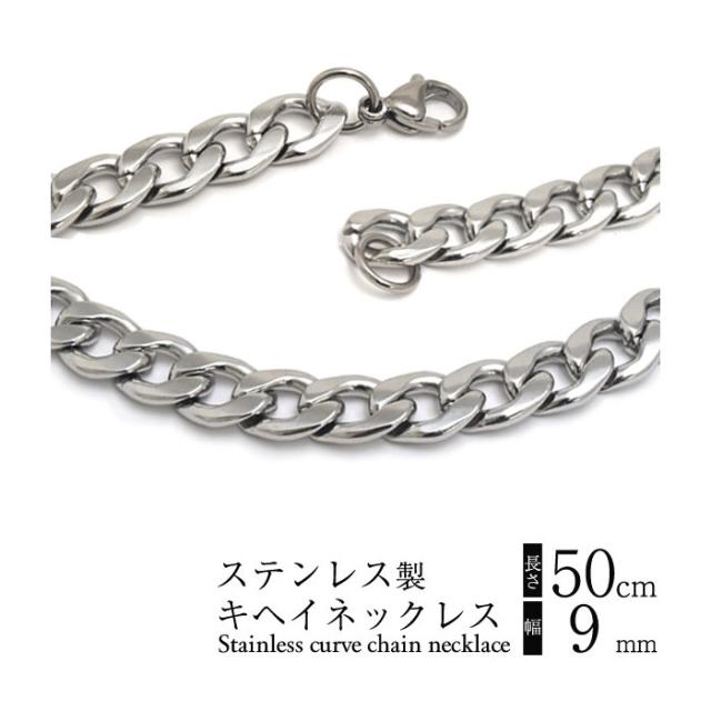 幅9mmで合わせやすい50cmのキヘイチェーンネックレスです。ステンレス製のため、錆びにくく酸化しにくいので、毎日お使いいただけます。一本だけでも存在感を発揮する太目の幅が特徴で、留め具は装着しやすいカニカンを使用しています。表面に施された面カットが、より高級感のある輝きを放ち、規則正しいカットがシャープな印象を与えます。