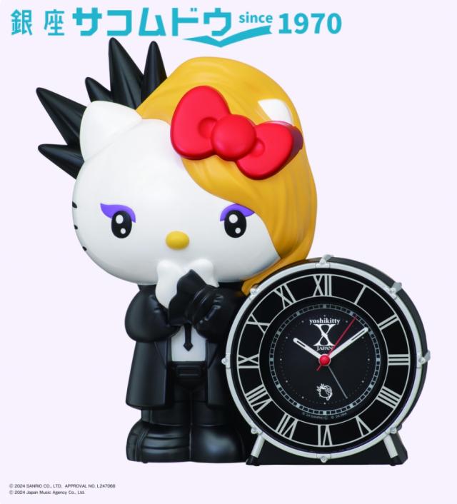 Xポーズをしたyoshikittyとドラムをイメージした時計がチャーミングです。