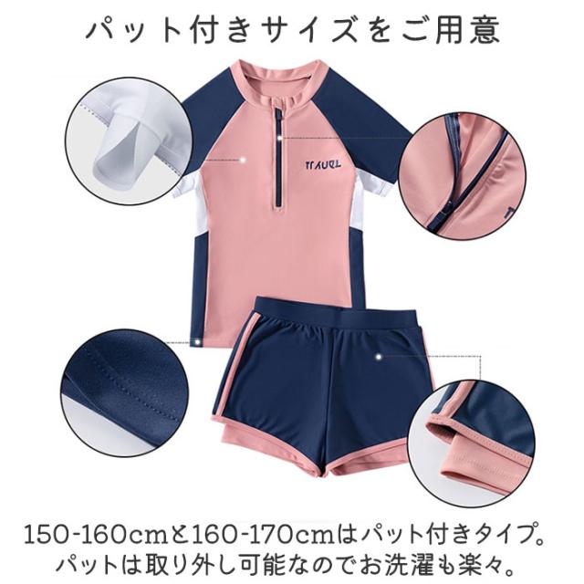 | 商品説明 | ・スポーティーで可愛い☆女の子も安心の優しい作り♪ ガールズ水着 が登場。 【ラッシュガード要らずの仕様】 ・半袖とショートパンツのセット。露出を控えた作りで、日焼け対策しながら水遊びができる! 【めくれにくいダブル仕様のパンツ】 ・ショートパンツはダブル仕様なので、水の中でもめくれにくい◎安心できる女の子に優しい作り。 【パット付きサイズをご用意】 150-160cmと160-170cmはパット付きタイプ。パットは取り外し可能なのでお洗濯も楽々。 【よく伸びる生地でストレスフリー】 ・伸縮性に優れた生地を使用し、お子様の元気な動きを邪魔しない!ストレスフリーな着心地。 【自分で着脱がしやすい】 ・お洋服のような形なので、1枚でサラっと着られて着替えがラクチン!ファスナーガードつき◎ 【速乾性でお手入れもラクラク】 ・速乾性のあるサラっとした生地。乾きやすいので、お洗濯が簡単!ママパパもラクチン。 【スポーティなデザインが今っぽい】 ・トレンドのスポーティなデザインが可愛い☆スイミングやプールの授業でも活躍! |