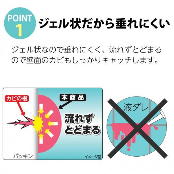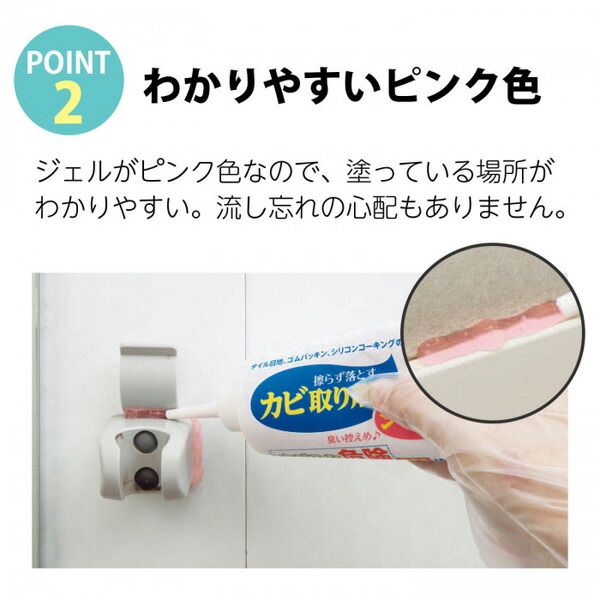 タイルの目地、ゴムパッキン、シリコンコーキングなどのカビは頑固でなかなか取れないですよね。『カビ取り剤ジェル状150g』なら、擦らずカビに塗って水で流すだけで簡単に落とせます!ピンク色のジェルが、カビにとどまるからカビの奥まで!いや〜な塩素臭も控えめで嬉しい♪プロも使う本格派。