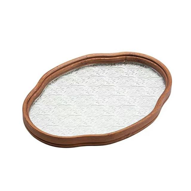 IwaiLoft ガラストレー 茶席 トレイ 【花海堂柄付き】 ガラス 木製 お盆 昭和 「シノワ・レトロ」 おしゃれ インテリア 小物入れ 茶道具