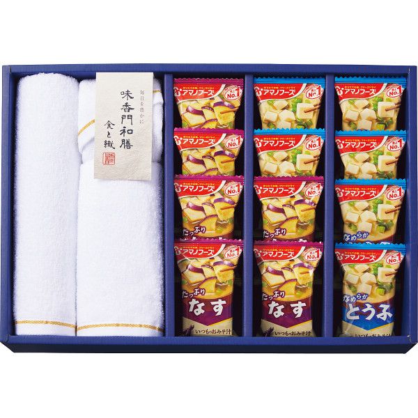 ●アマノフーズフリーズドライいつものおみそ汁(なす×6・とうふ×6)・フェイスタオル(約32×75cm・綿100%・日本製)2枚・ハンドタオル(約32×34cm・綿100%・日本製)1枚