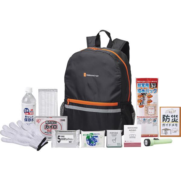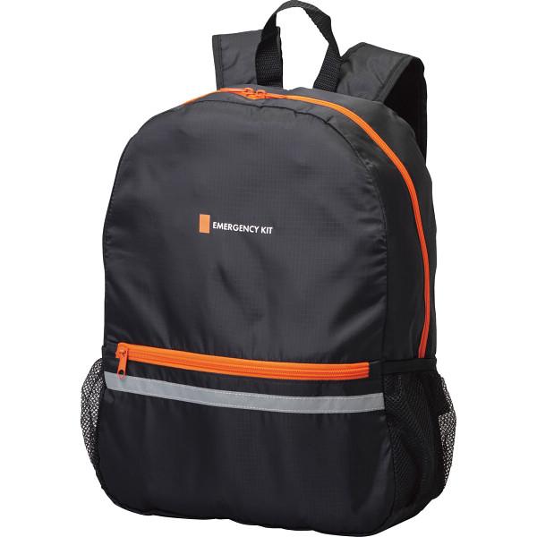 エマージェンシーリュック BK・蓄光LEDライト(単3乾電池2本使用・別売)・水に流せるポケットティッシュ・ウェットティッシュ(5年保存)・非常用給水バッグ(約3l)・携帯トイレ(1回分)・使い捨てカイロ・使い捨てマスク・絆創膏/綿棒セット(絆創膏×2枚・一般医療機器製造販売届出番号:15B3X10004000001・綿棒×10本)・保存水(500ml)・軍手・防災ガイドメモ×各1保存水=賞味期間5年6ヶ月