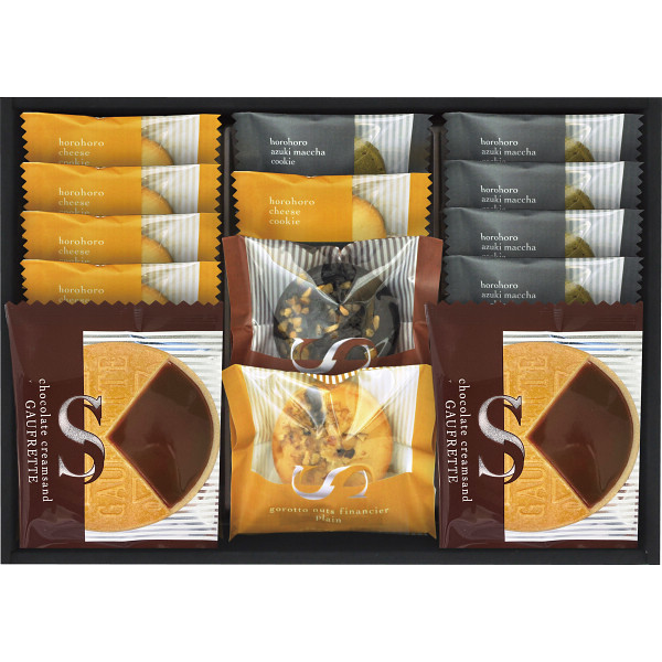 ココアパウダーを2種類配合したチョコフィナンシェ、バニラビーンズソースを練り込みしっとりと焼き上げたバニラフィナンシェ、くるみ、アーモンド、ドライクランベリーをトッピングした2種類のごろっとナッツフィナンシェ、3種のチーズを使用し風味豊かでさっくりとしたチーズクッキーと、抹茶パウダーとフリーズドライの小豆を一緒に練り込んだ抹茶クッキー、上品な味わいに仕上げたチョコゴーフレットの詰合せです。