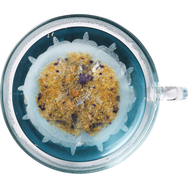 ノンカフェインで眠る前のティータイムに最適。クラゲの形をしたティーバッグの中にカモミールと天然の青い成分を含むバタフライピーが入っております。バタフライピーにはアントシアニンが含まれており、眼精疲労に効果があるといわれております。カモミールには心を落ち着ける作用があり、就寝前のリラックスに効果的です。たっぷりのカモミールに、綺麗なエメラルドグリーンになるようにバタフライピーを絶妙にブレンドしております。クラゲのティーバッグと共に癒されながらリラックスした夜をお過ごしください。最近忙しくてしっかり休めていない人へのプレゼントにもおすすめです。