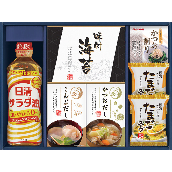 ●日清サラダ油400g×1、有明海産味のり(8切8枚×2)×1、かね七かつおだし(4g×5)×1、かね七こんぶだし(4g×5)×1、たまごスープ(フリーズドライ)6.4g×2、マルトモかつおパック(0.7g×3)×1