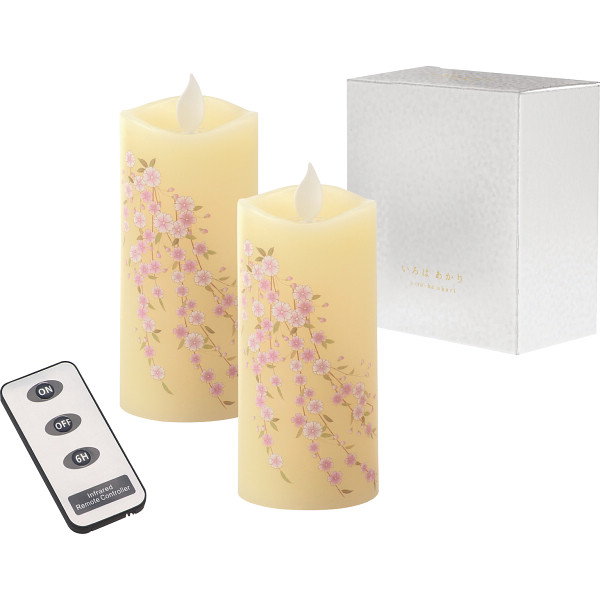 ゆらゆらとやさしく揺らぐリアルな炎は、樹脂製の炎にLEDの光を照らし、電磁石による磁力の反発を応用して限りなく自然に近い揺らぎを表現しています。ボディ全体が明るく光り、ほのかな灯りが、辺りをやさしく照らします。同柄のいろはあかり2本(リモコン付)をギフト箱に入れたご進物です。