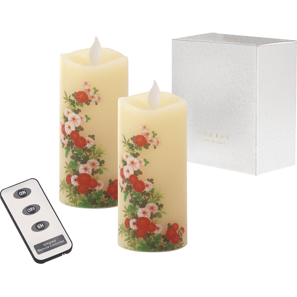 ゆらゆらとやさしく揺らぐリアルな炎は、樹脂製の炎にLEDの光を照らし、電磁石による磁力の反発を応用して限りなく自然に近い揺らぎを表現しています。ボディ全体が明るく光り、ほのかな灯りが、辺りをやさしく照らします。同柄のいろはあかり2本(リモコン付)をギフト箱に入れたご進物です。