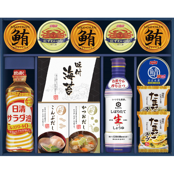 ●日清サラダ油400g×1、有明海産味のり(8切8枚×2)×1、かね七かつおだし(4g×5)×1、かね七こんぶだし(4g×5)×1、たまごスープ(フリーズドライ)6.4g×2、キッコーマンしぼりたて生しょうゆ450ml×1、まぐろ油漬け70g×3、ニッスイ紅ずわいがにほぐし身55g×2、ニッスイさば水煮150g×1