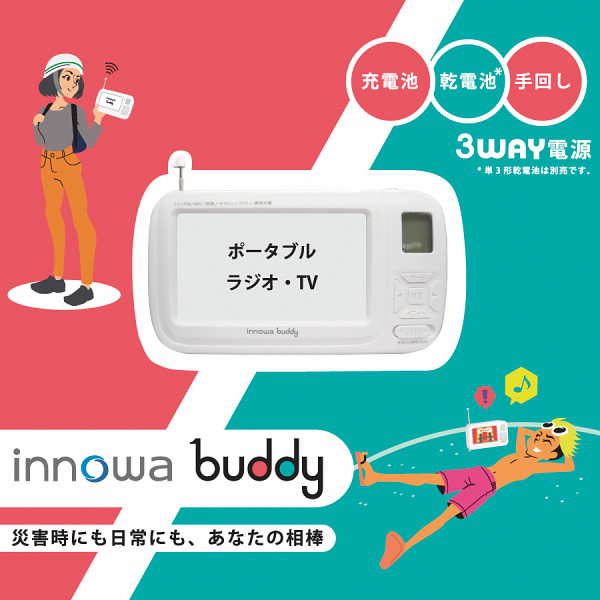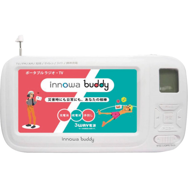 イノワバディ ポータブルラジオ・TV ホワイト BD001 | 24-0372-035ポータブルテレビ ラジオ 3WAY充電 モバイルバッテリー LEDライト サイレン スマホ充電 蓄光シール ハンドストラップ 災害時 日常 防災ラジオ 防災テレビ ハンド