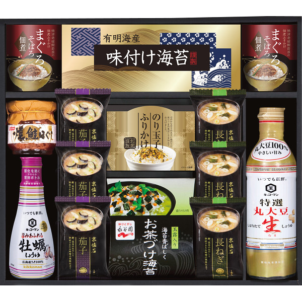 ●マルコメ京懐石のおみそ汁(茄子11.5g・長ねぎ15.7g)(フリーズドライ)×各3、まぐろそぼろ佃煮(7g×2)×2、有明海産味付け海苔(3切6枚)・ニッスイ焼鮭ほぐし50g・のり玉子ふりかけ(4.5g×2)・永谷園お茶づけ海苔(6.3g×3)・キッコーマン牡蠣しょうゆ200ml・キッコーマンしぼりたて丸大豆生しょうゆ450ml×各1