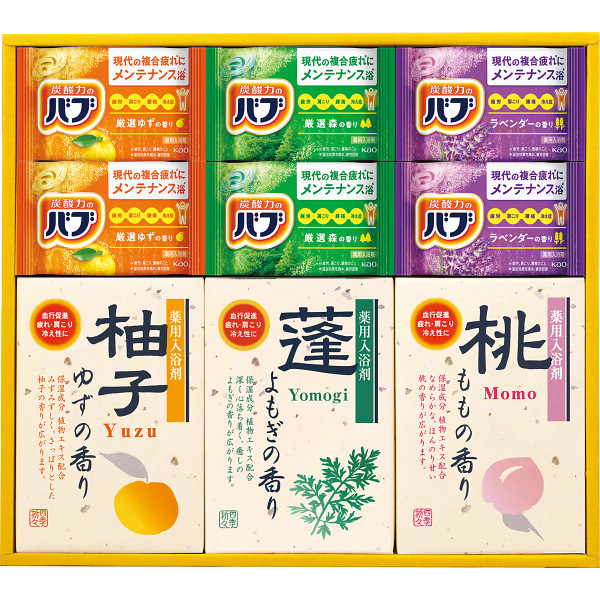 ●バブ(ゆず・森・ラベンダー)×各2、薬用入浴剤(ゆず・よもぎ・もも)(25g×2)×各1※医薬部外品