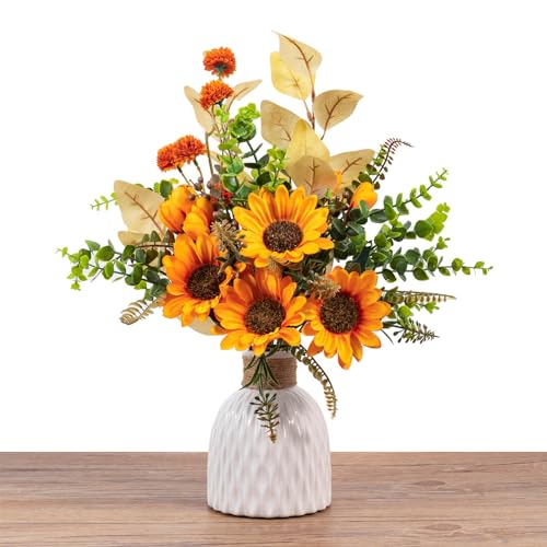 WillingYou 造花 インテリア 花瓶付き 玄関 向日葵 花瓶セット (ひまわり花束、陶瓷花瓶) オレンジ