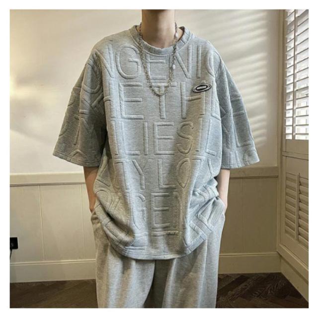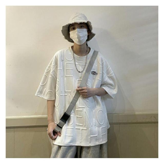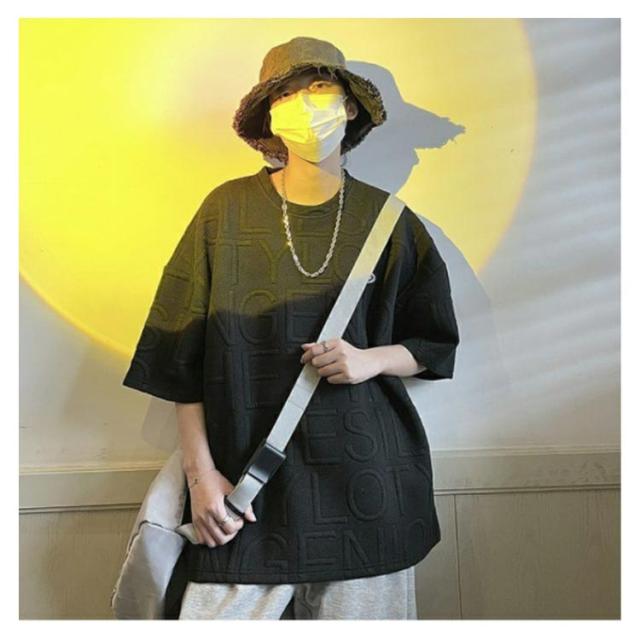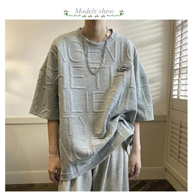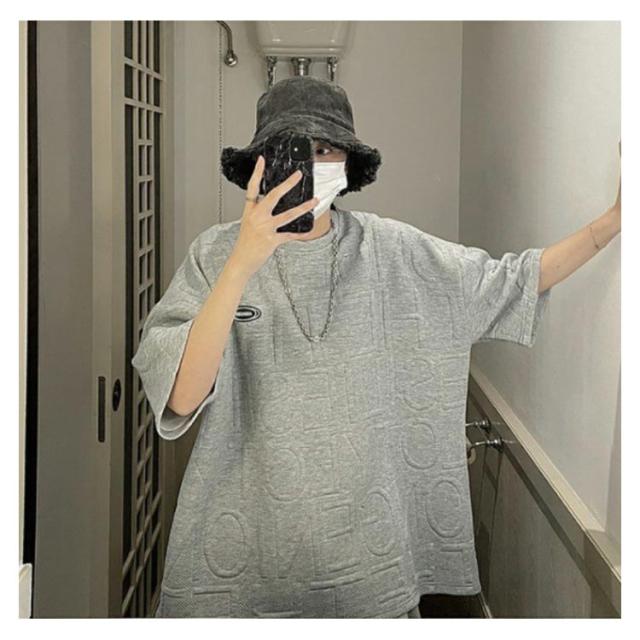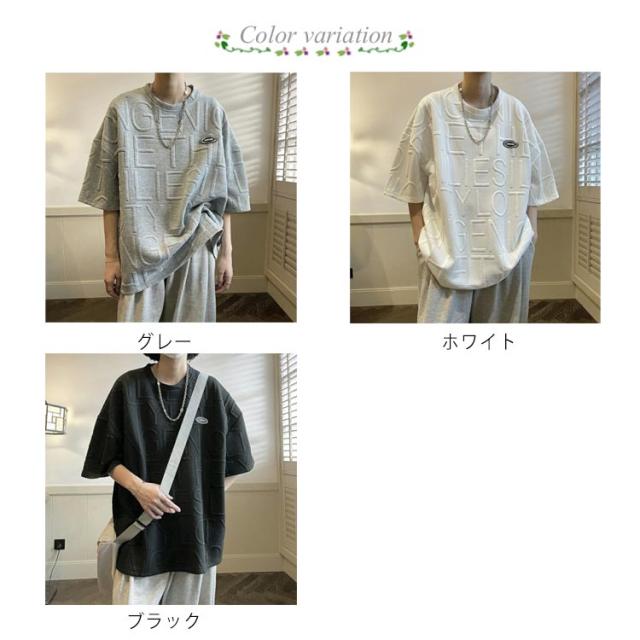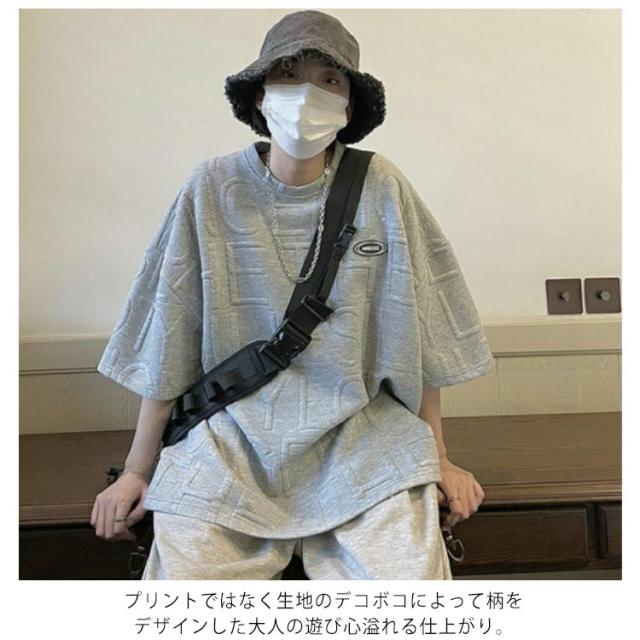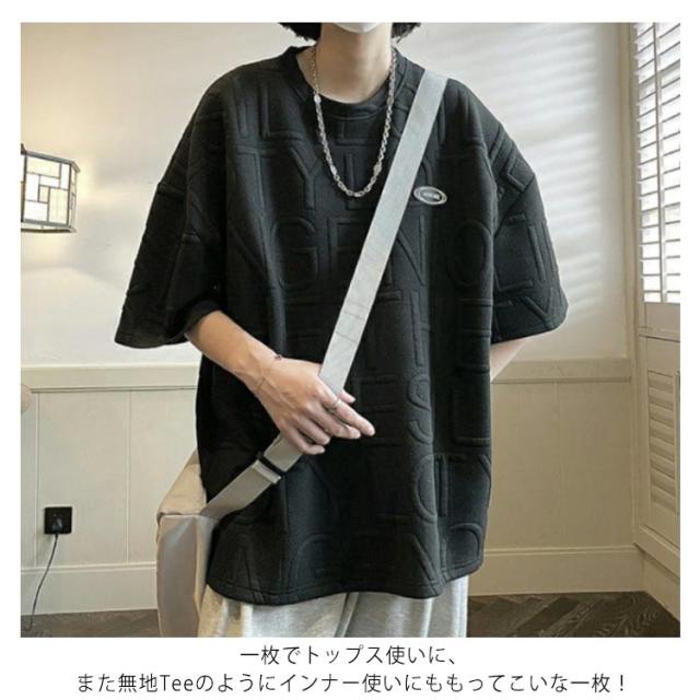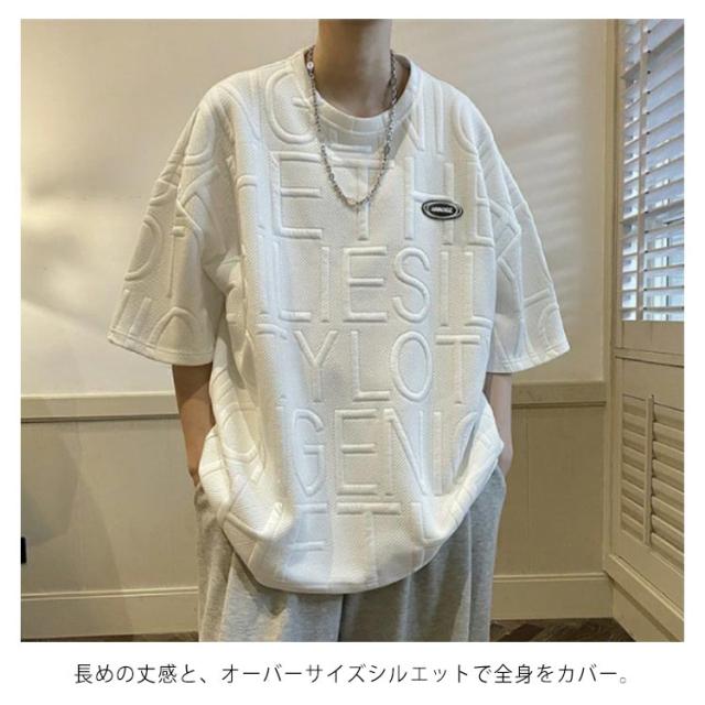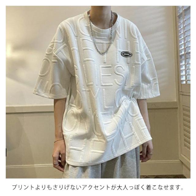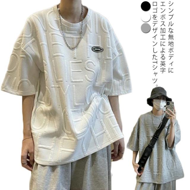 エンボス ロゴ Tシャツ ロゴT レディース 半袖 五分袖 ロゴ ゆったり 体型カバー カットソー トップス 立体 3D 英字 ロング丈 楽ちん プルオーバー チュニック スウェット トレーナー エンボス加工 春 夏 男女兼用 送料無料