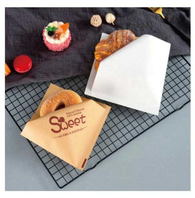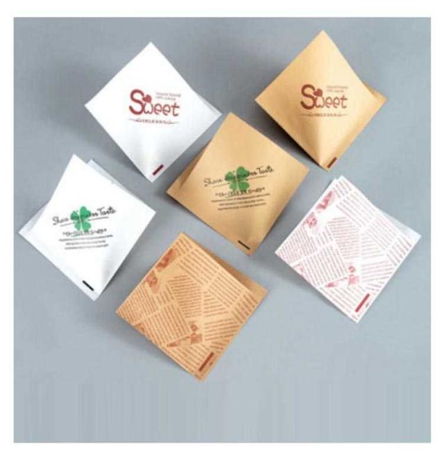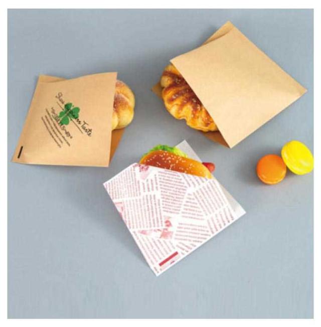 | ハンバーガー等の食材を包むスナック袋です。 耐油耐水紙を使用しており、揚げ物も包めて便利です。 四辺のうち二辺の口があいたタイプの袋で袋が開きやすくなっています。 ハンバーガーだけでなく、おにぎりやサンドイッチ、肉まん、ドーナツ、シュークリームなど、幅広いメニューに対応できます。 | |
